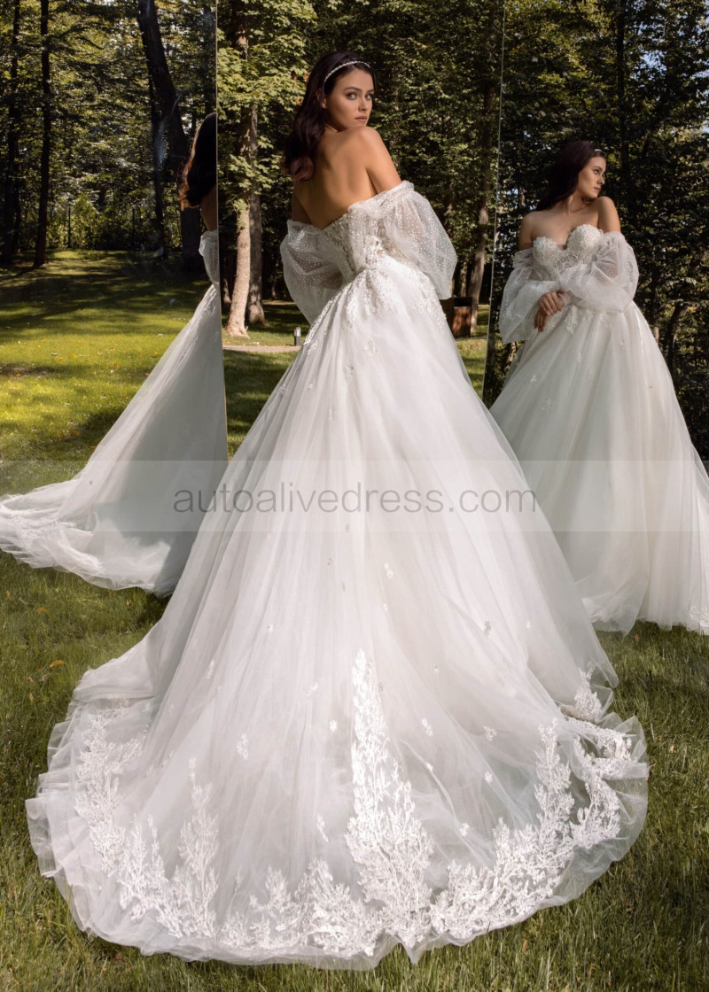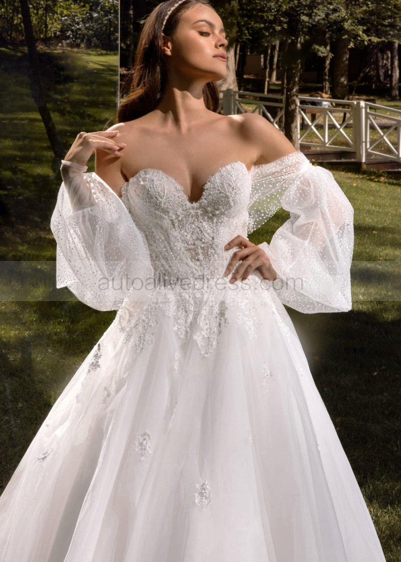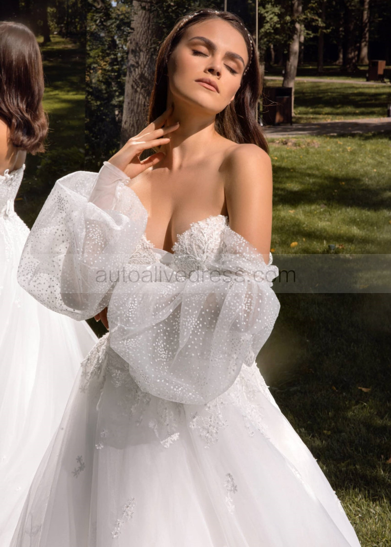 Off Shoulder Beaded Ivory Lace Tulle Shinning Wedding Dress