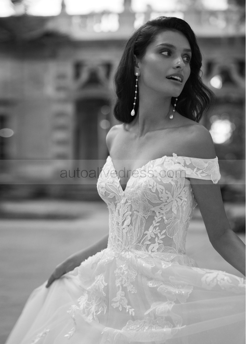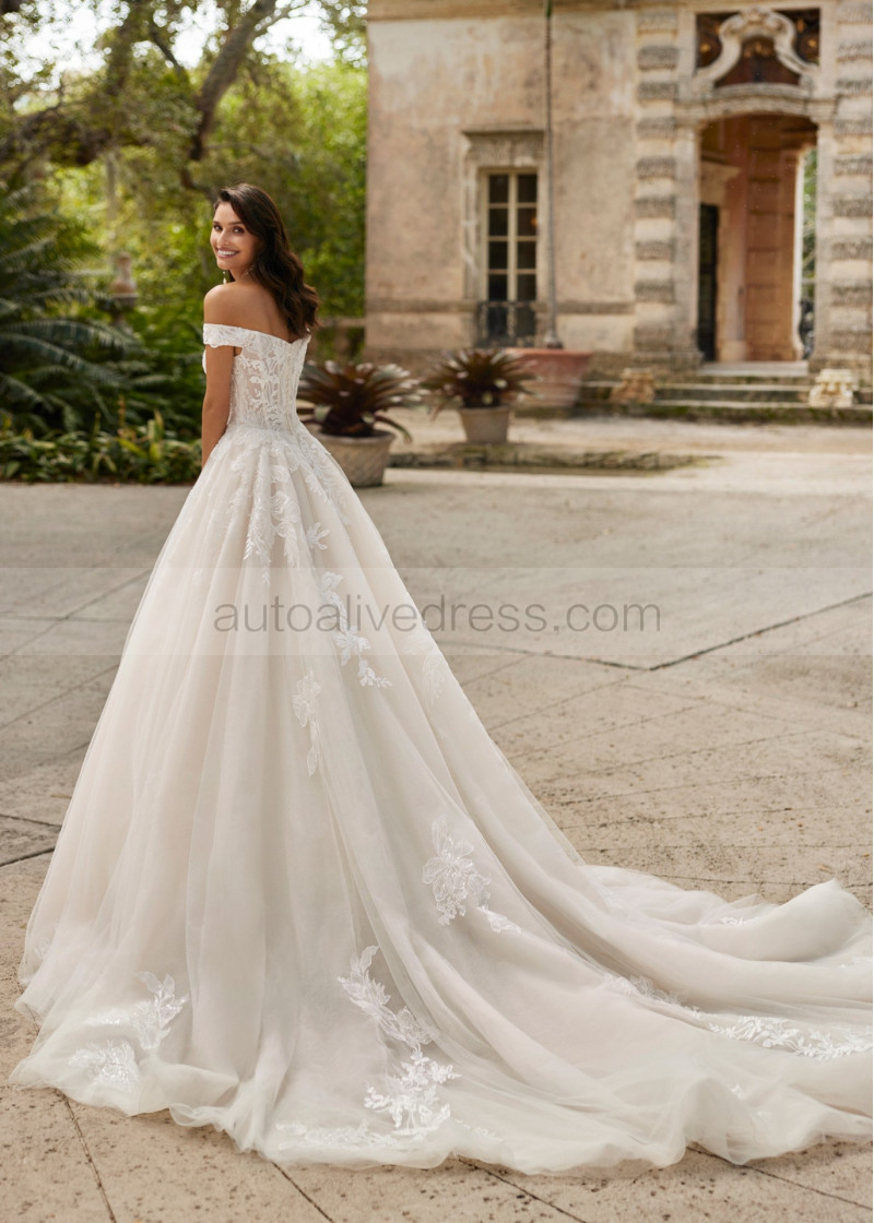 Off Shoulder Beaded Ivory Lace Tulle Sparkling Wedding Dress