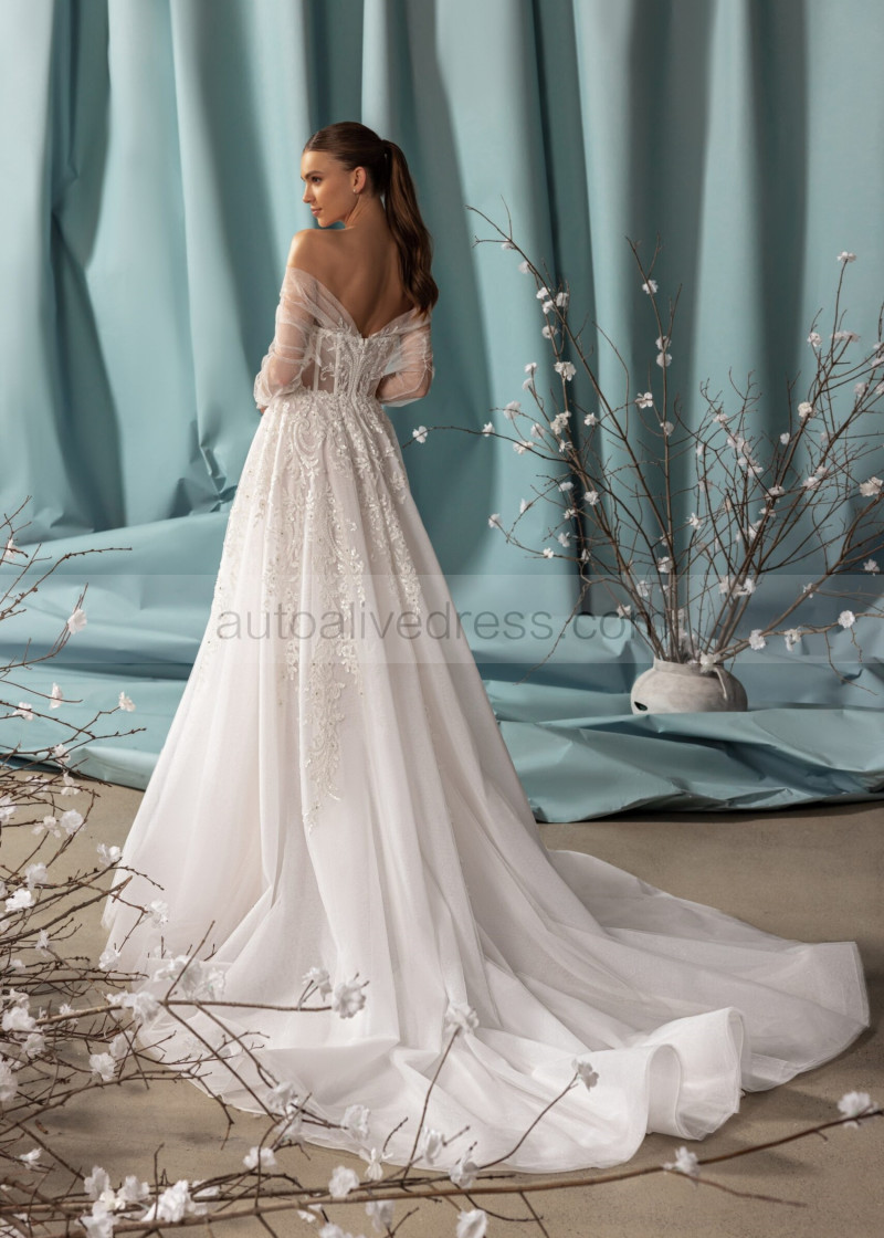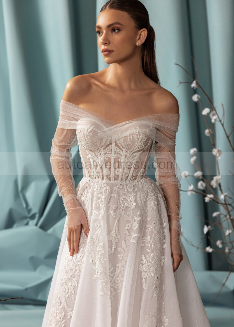 Off Shoulder Beaded Ivory Lace Tulle Wedding Dress