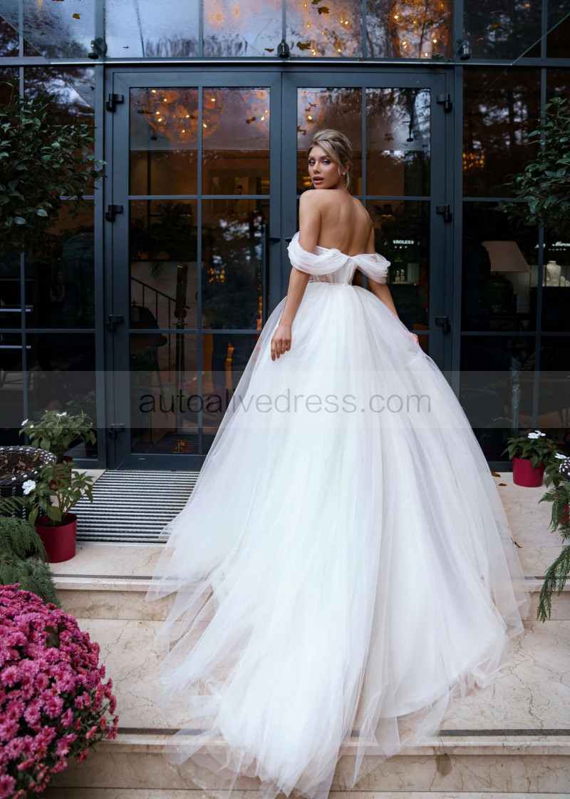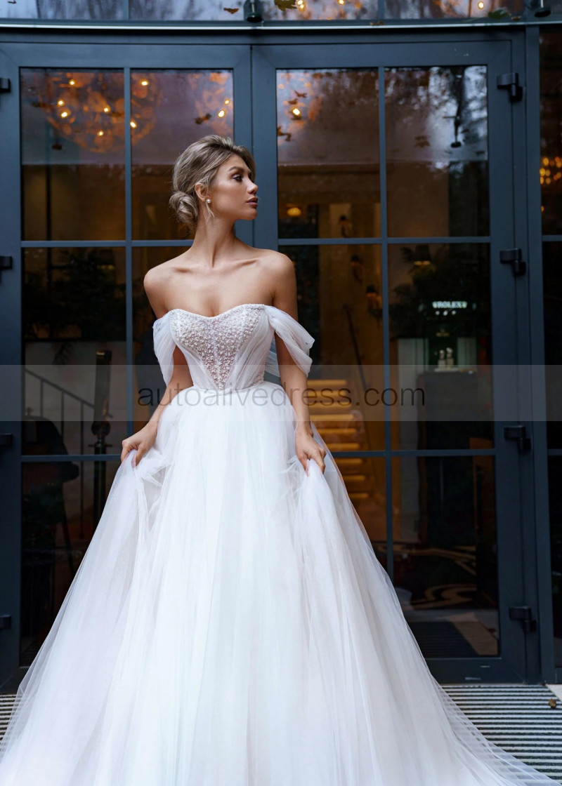 Off Shoulder Beaded White Tulle Princess Wedding Dress