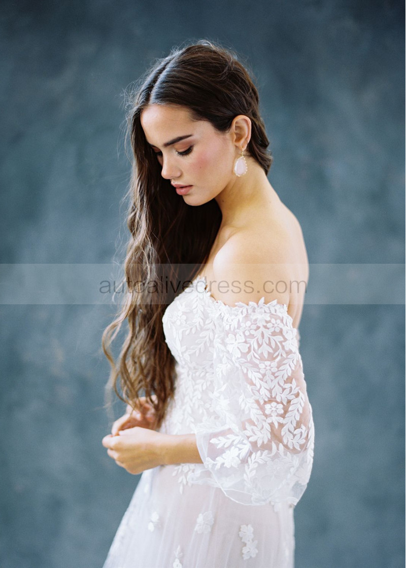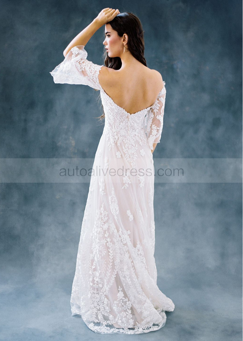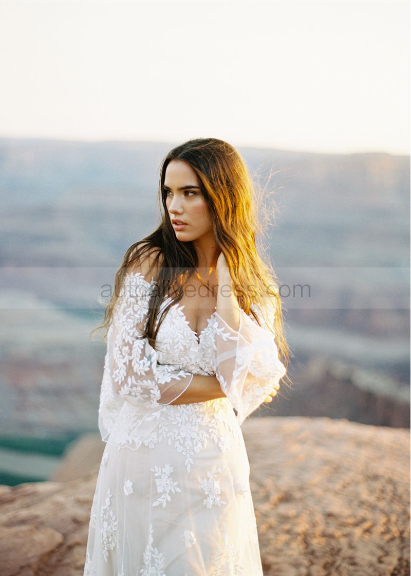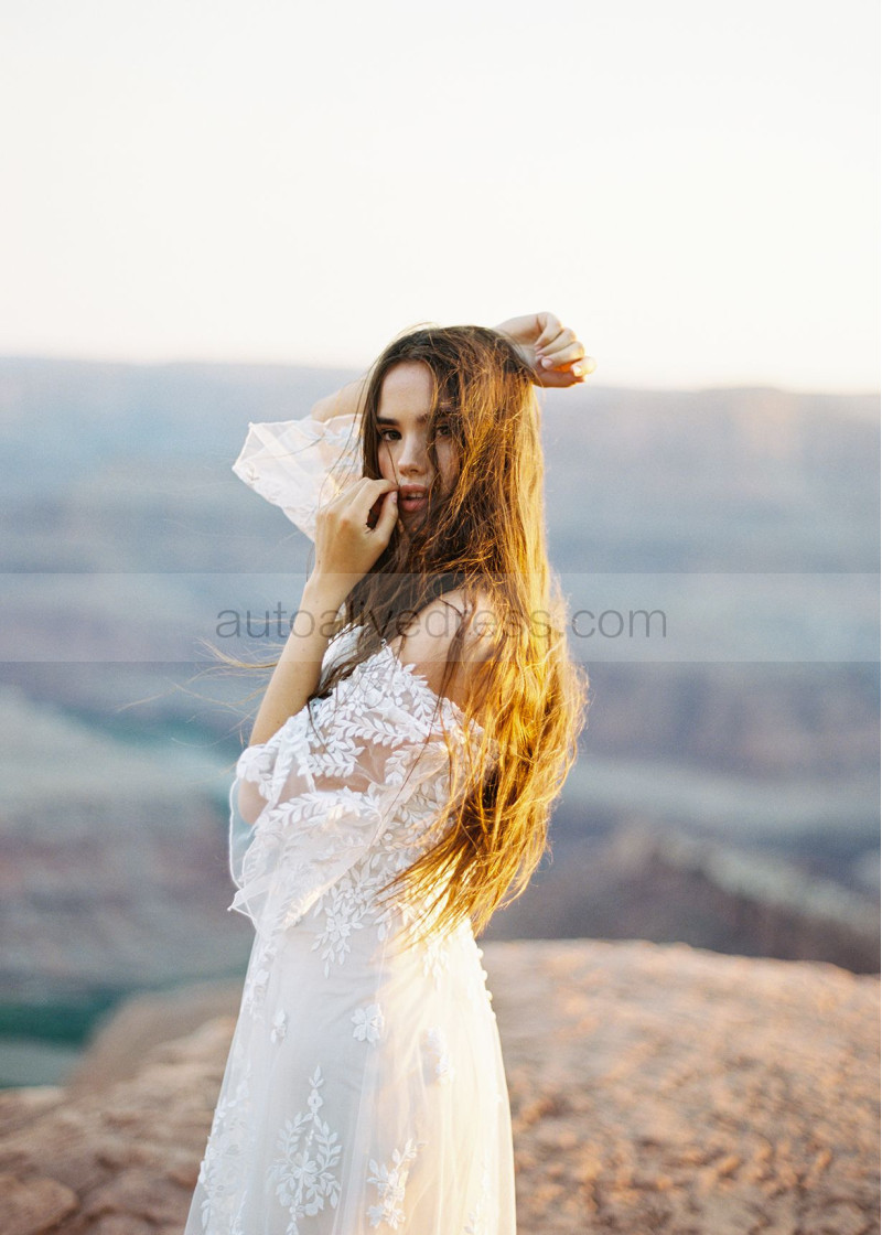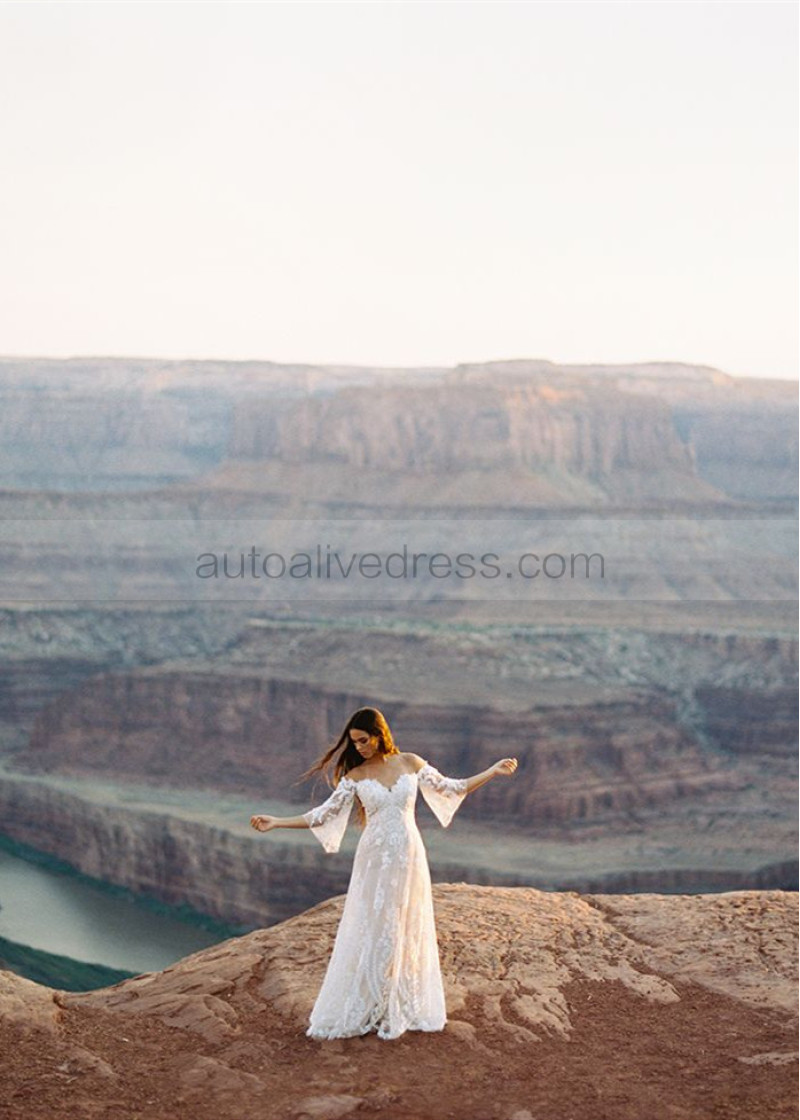 Off Shoulder Bell Sleeve Ivory Lace Tulle Wedding Dress