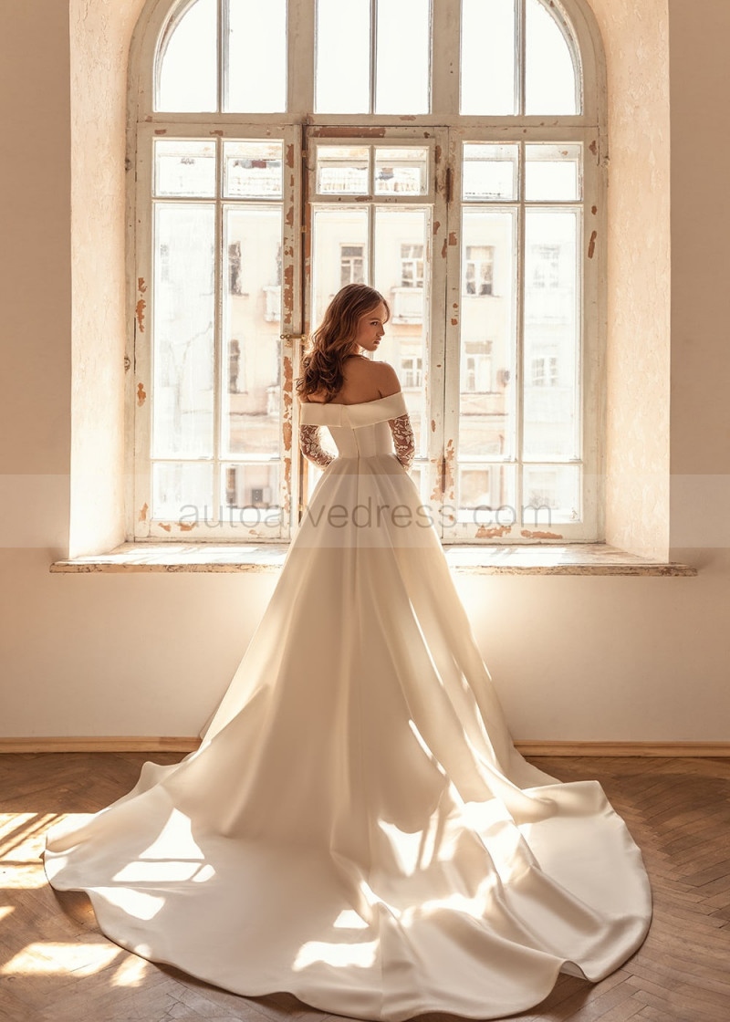 Off Shoulder Ivory Beaded Lace Satin Elegant Wedding Dress