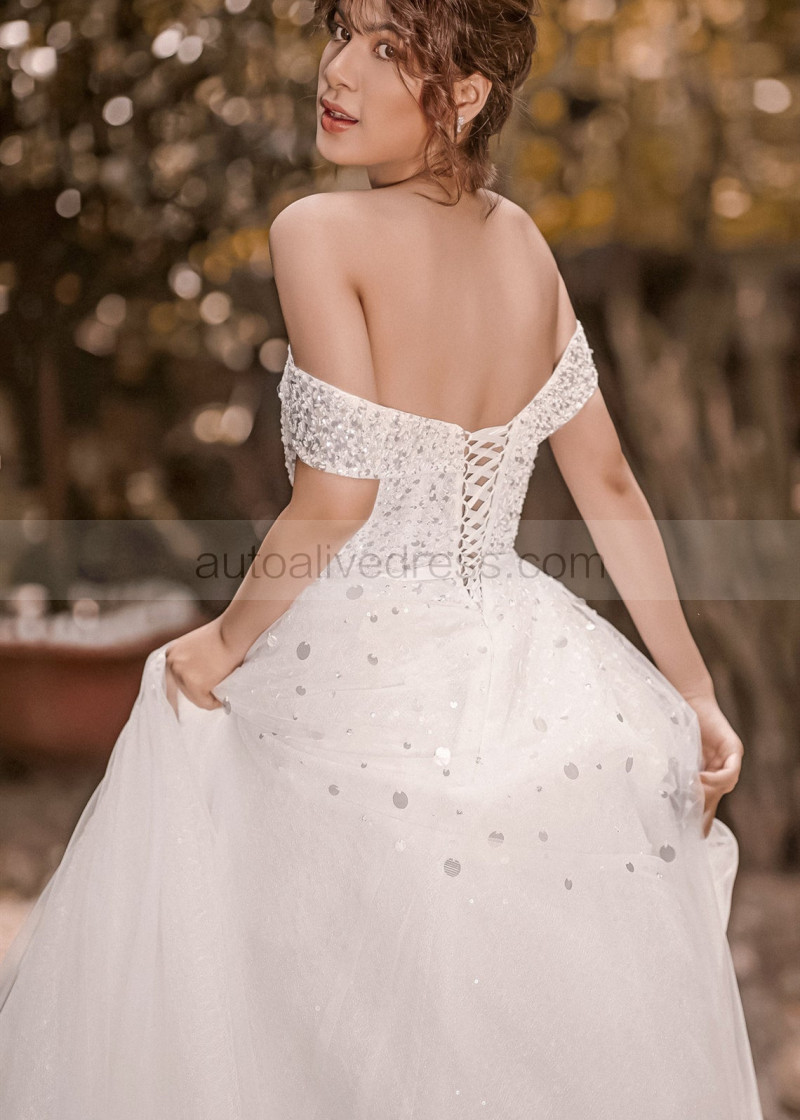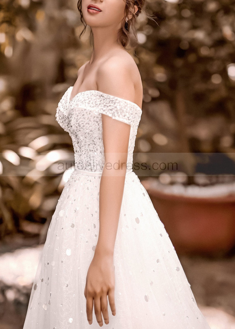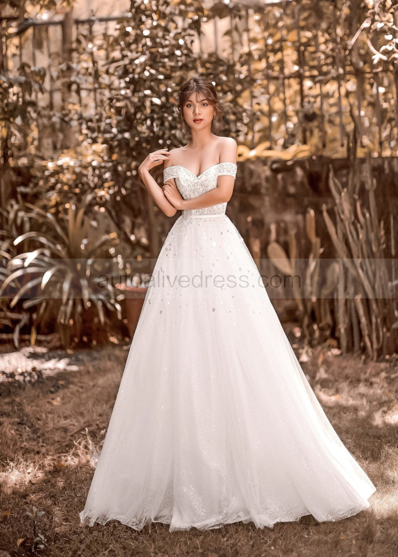 Off Shoulder Ivory Bling Bling Tulle Wedding Dress