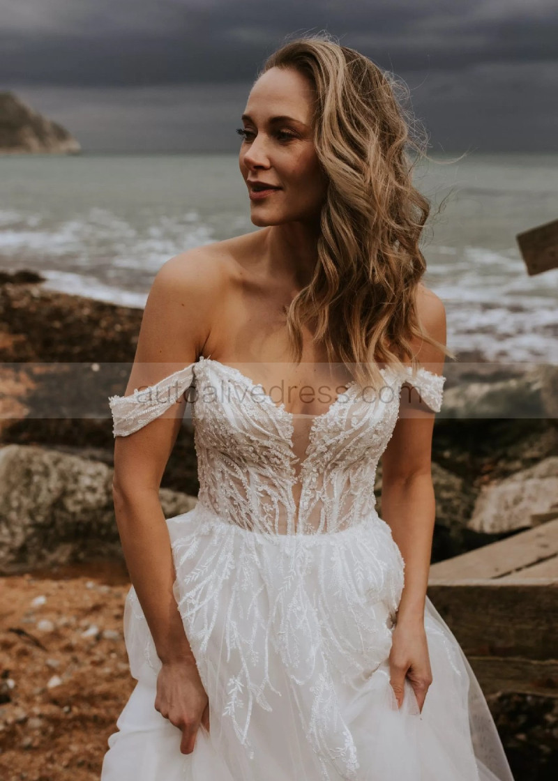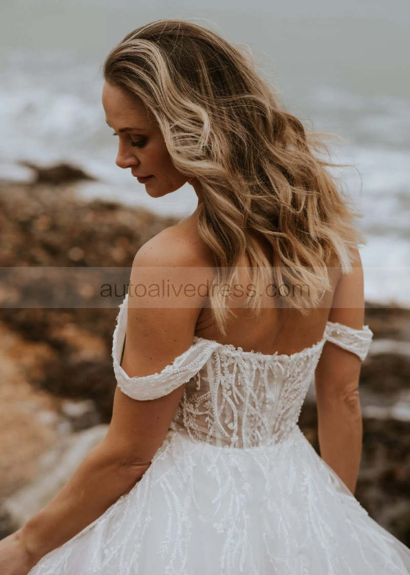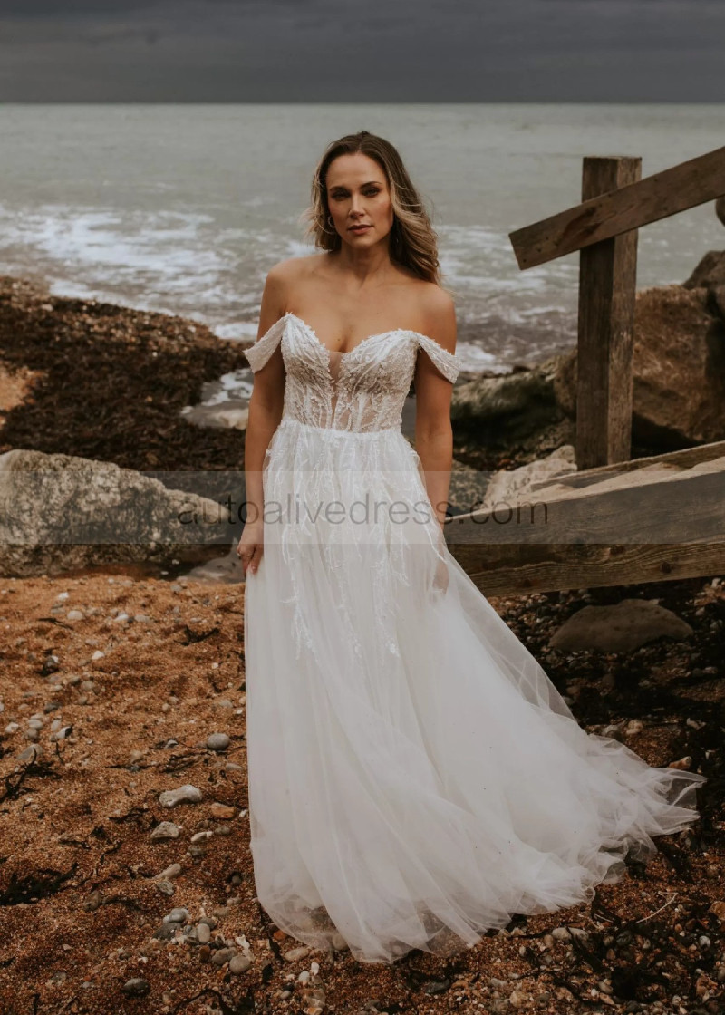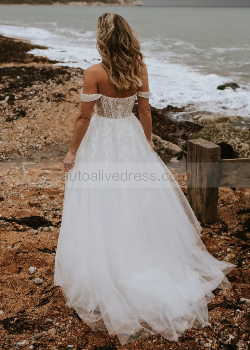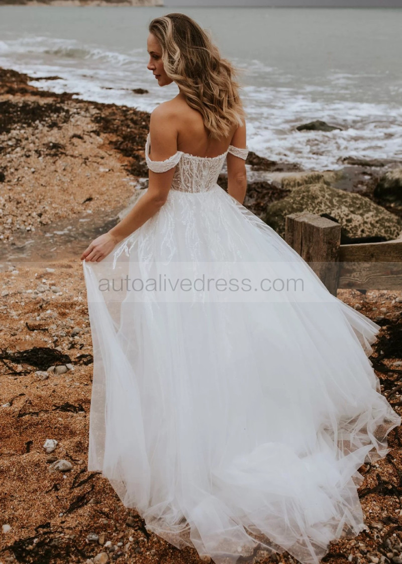 Off Shoulder Ivory Glitter Lace Tulle Flowing Wedding Dress