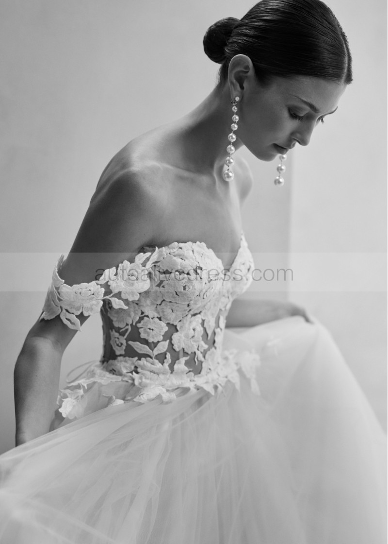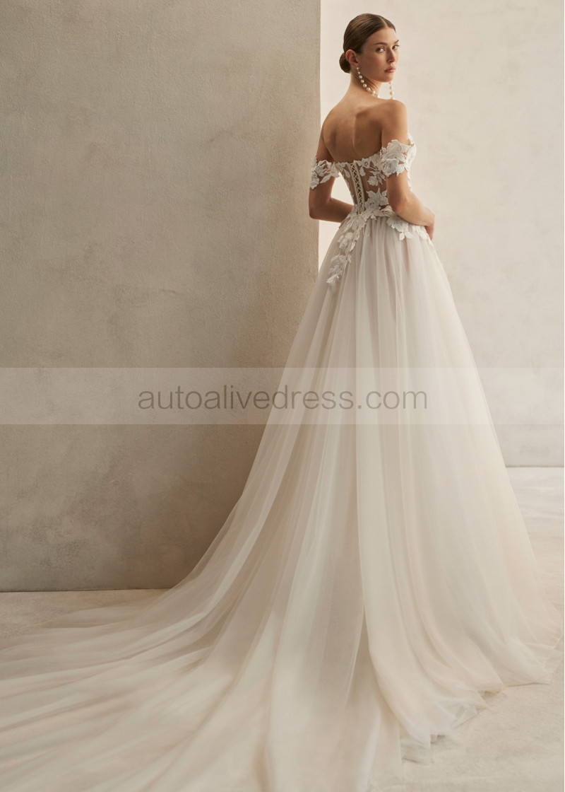 Off Shoulder Ivory Lace Tulle Corset Back Chic Wedding Dress
