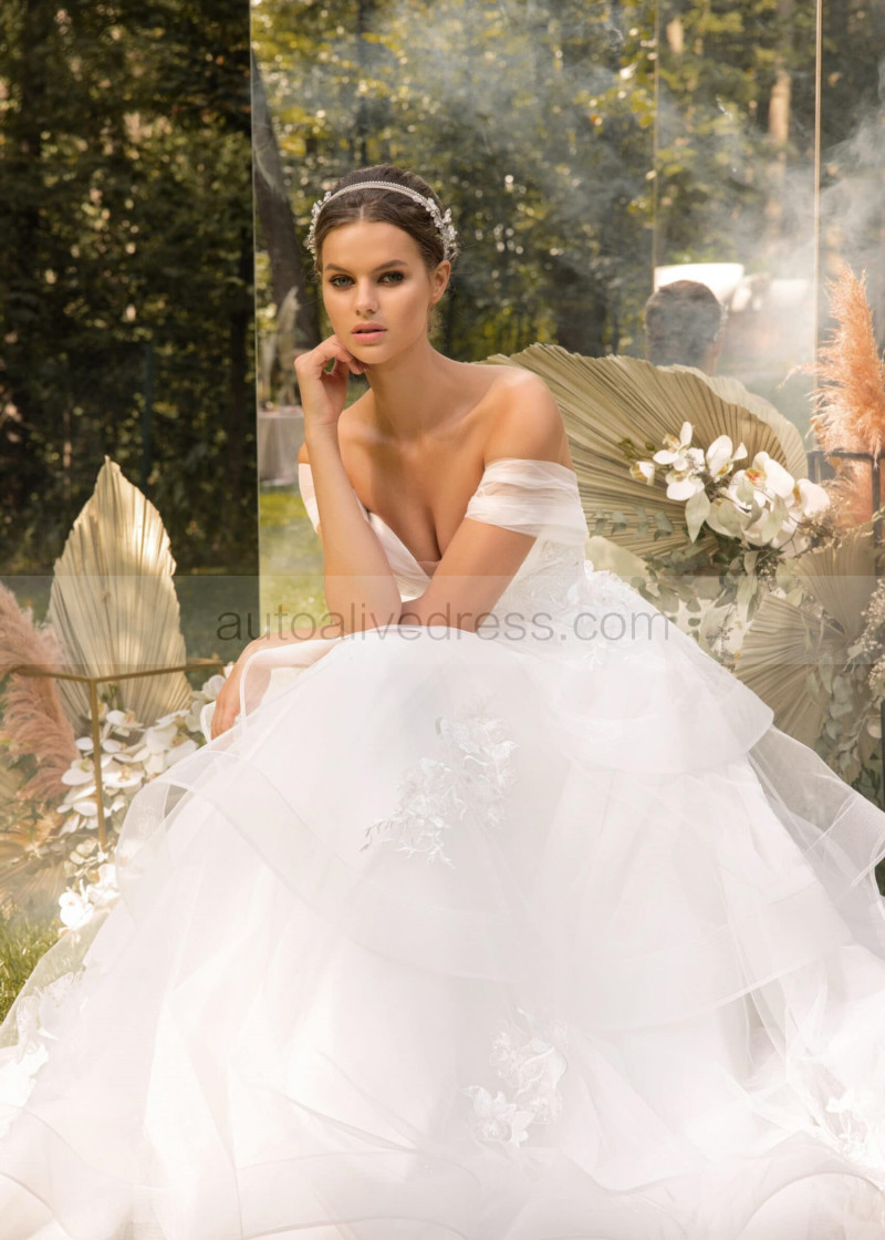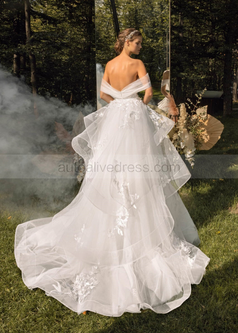Off Shoulder Ivory Lace Tulle Ruffled Wedding Dress With Horsehair Trim