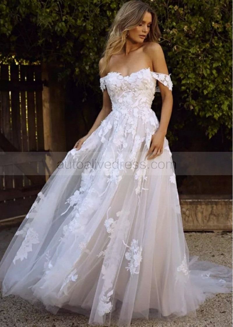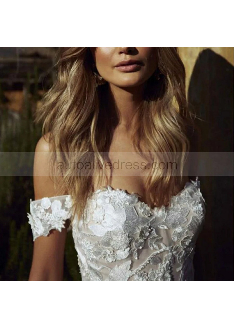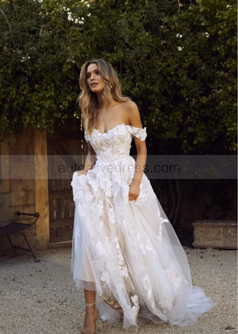 Off Shoulder Ivory Lace Tulle Wedding Dress With Champagne Lining