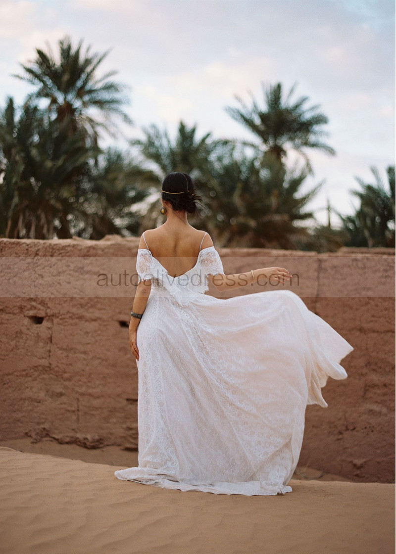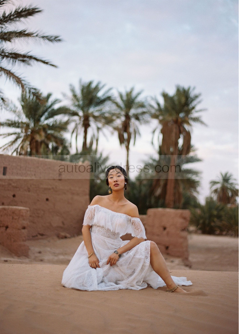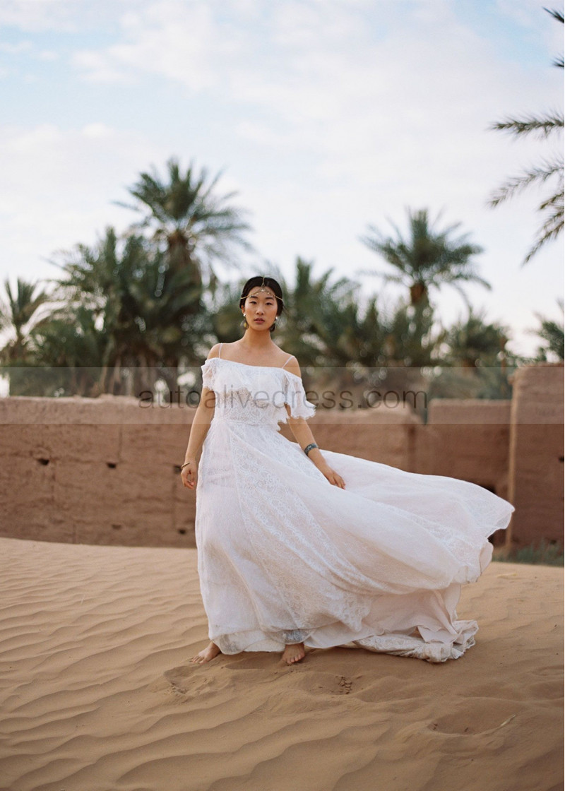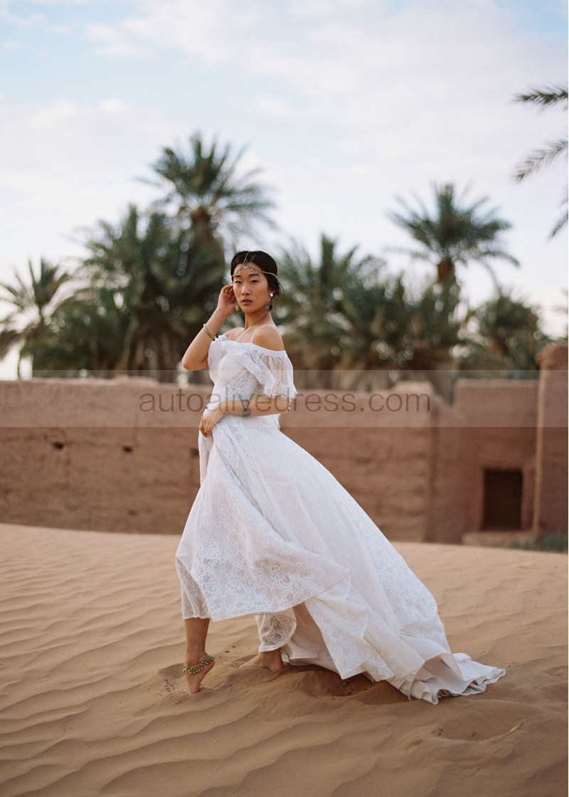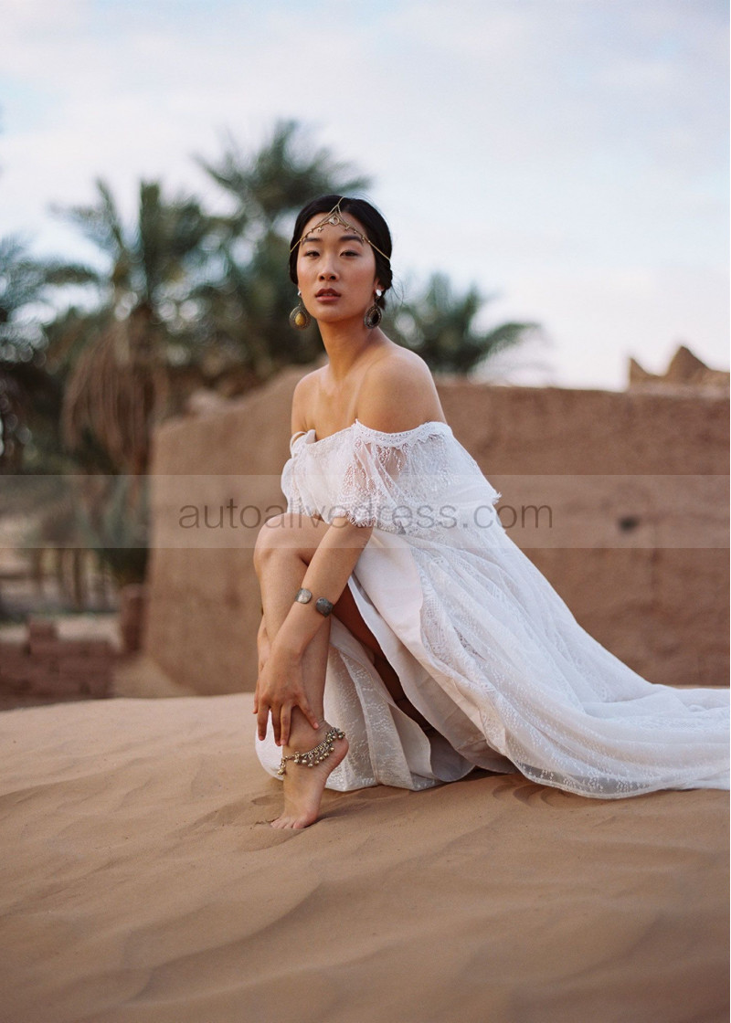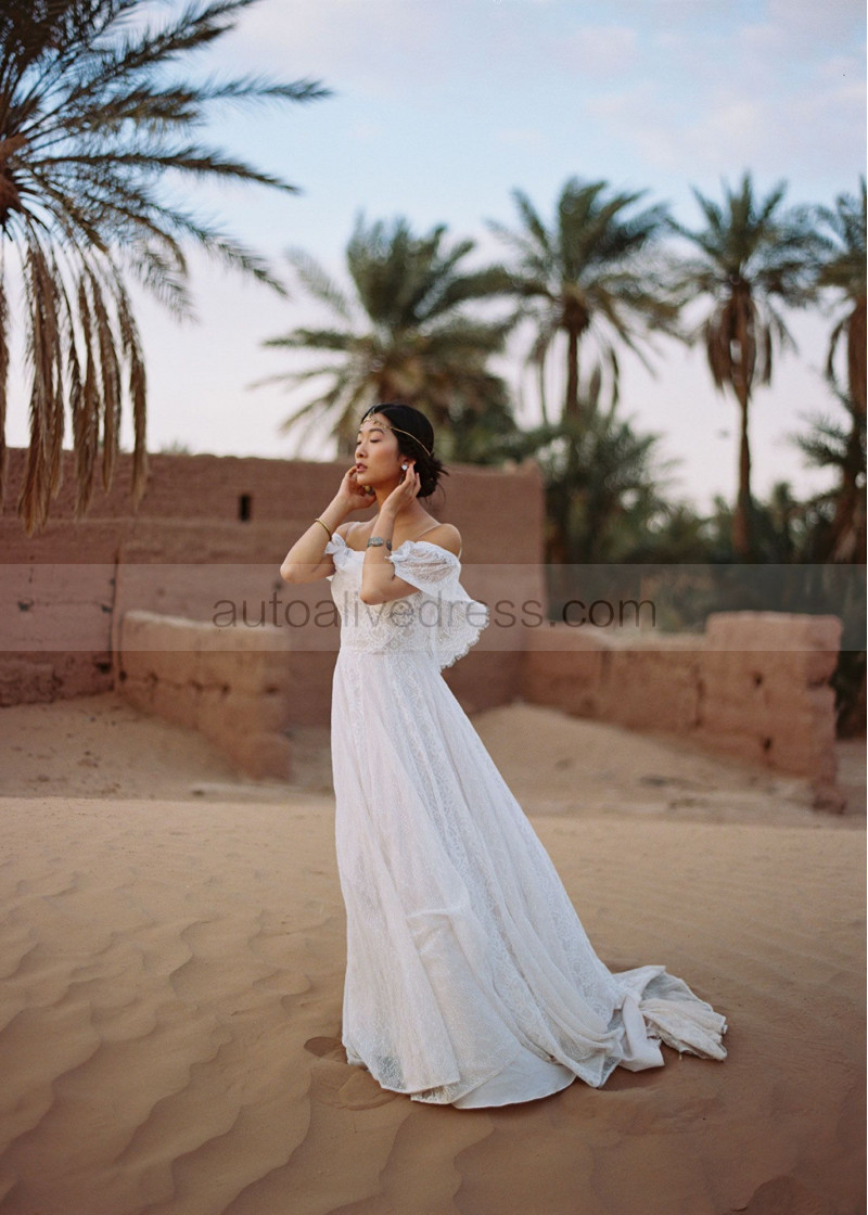 Off Shoulder Ivory Lace Wedding Dress With Court Train