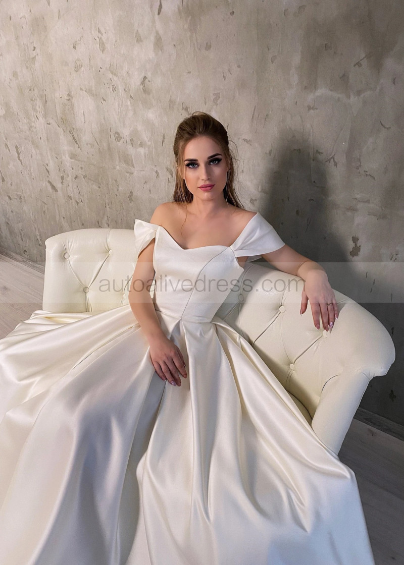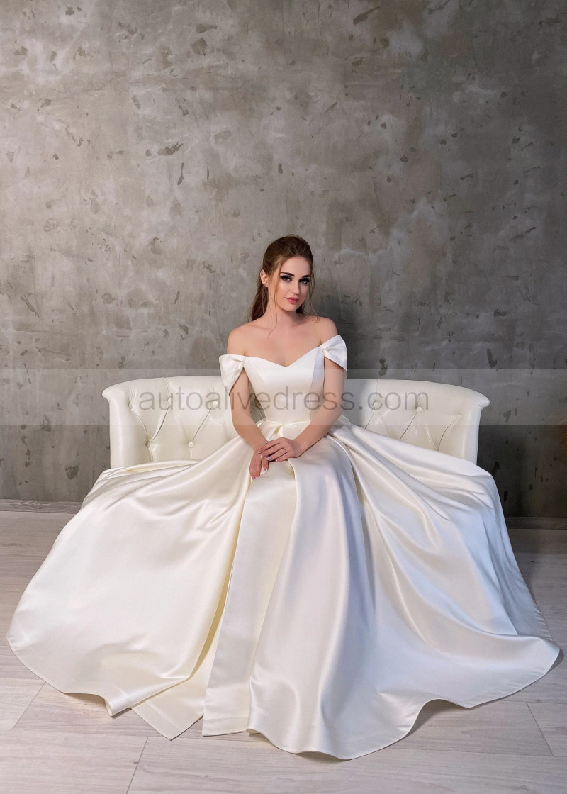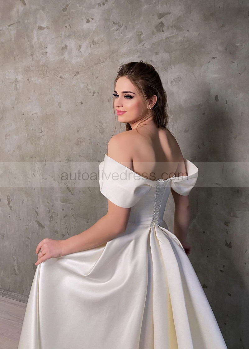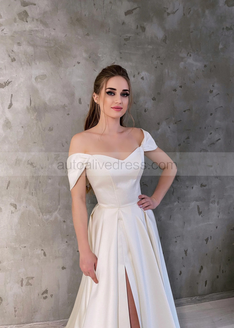 Off Shoulder Ivory Satin High Slit Simple Wedding Dress
