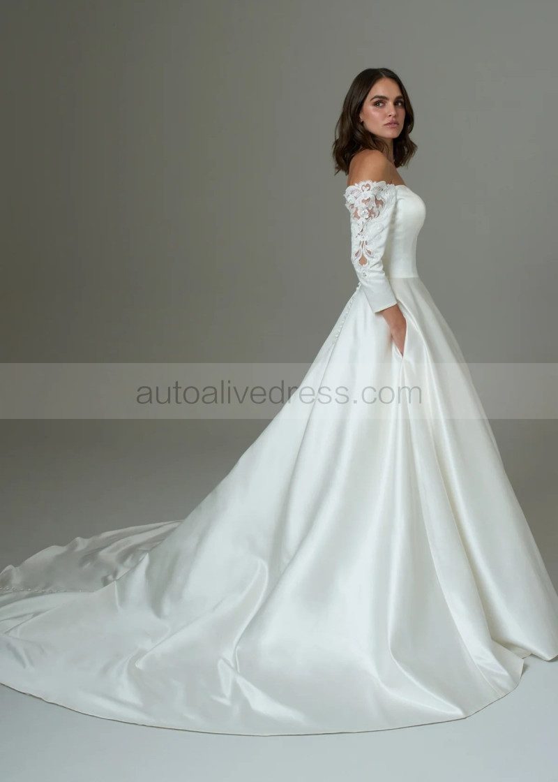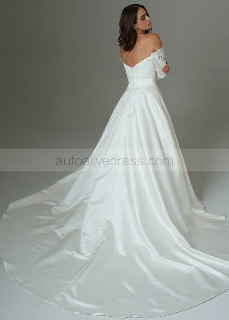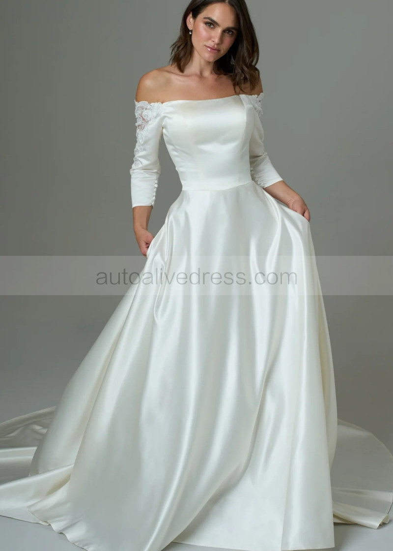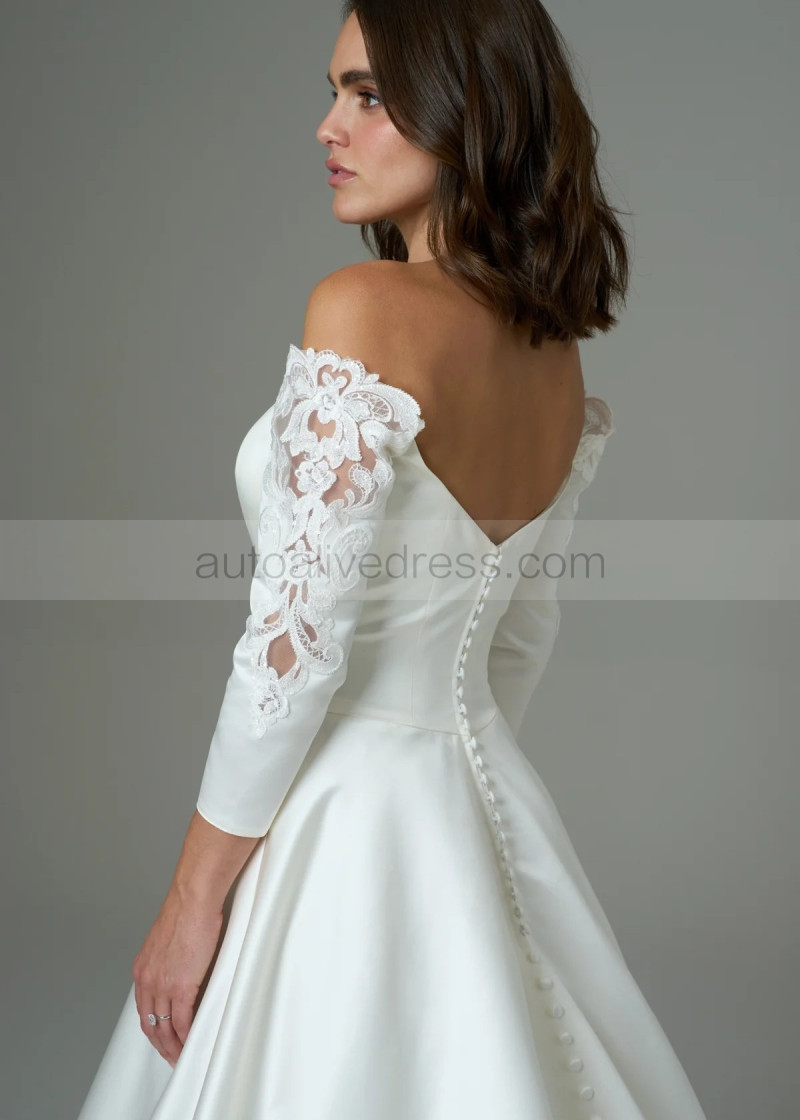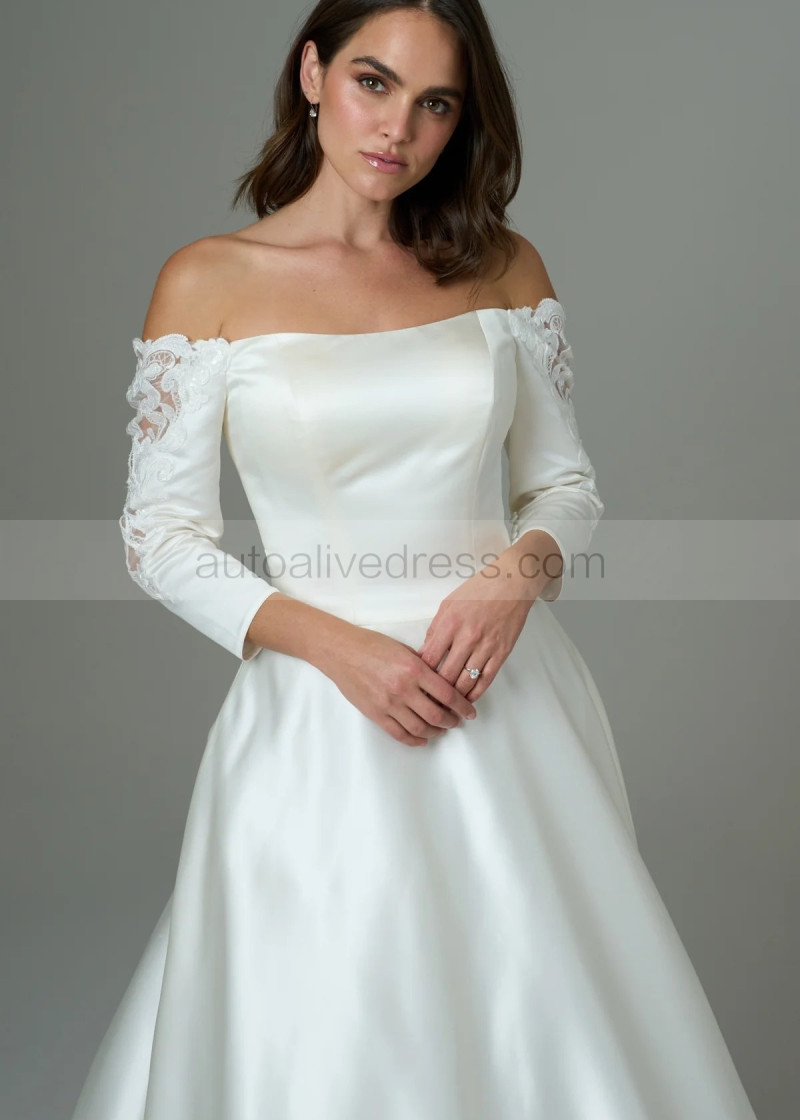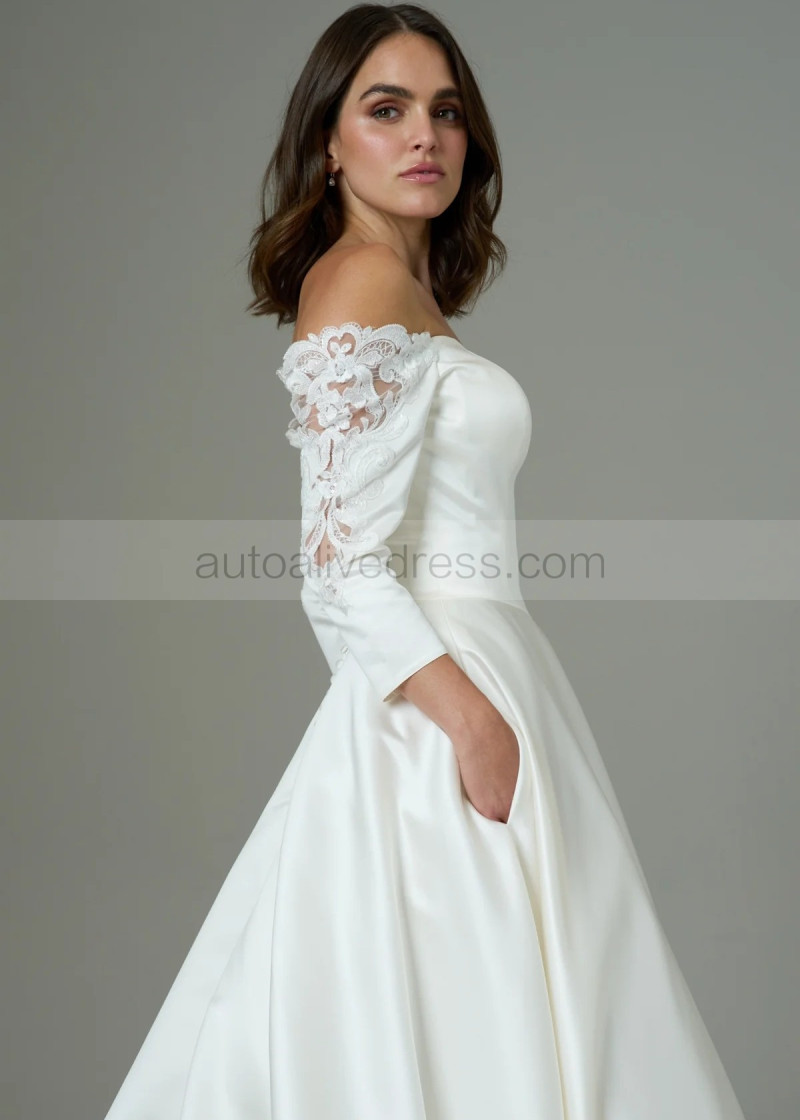 Off Shoulder Ivory Satin Lace Minimalist Wedding Dress