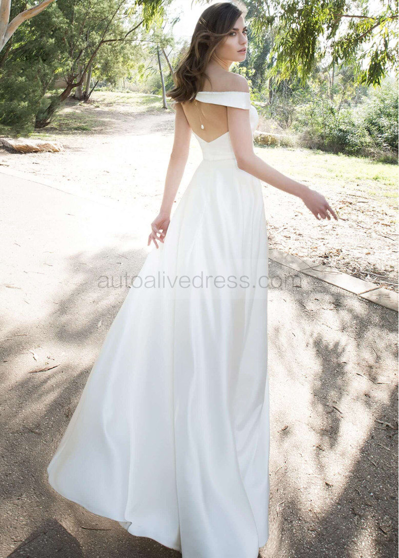 Off Shoulder Ivory Satin Slit Wedding Dress