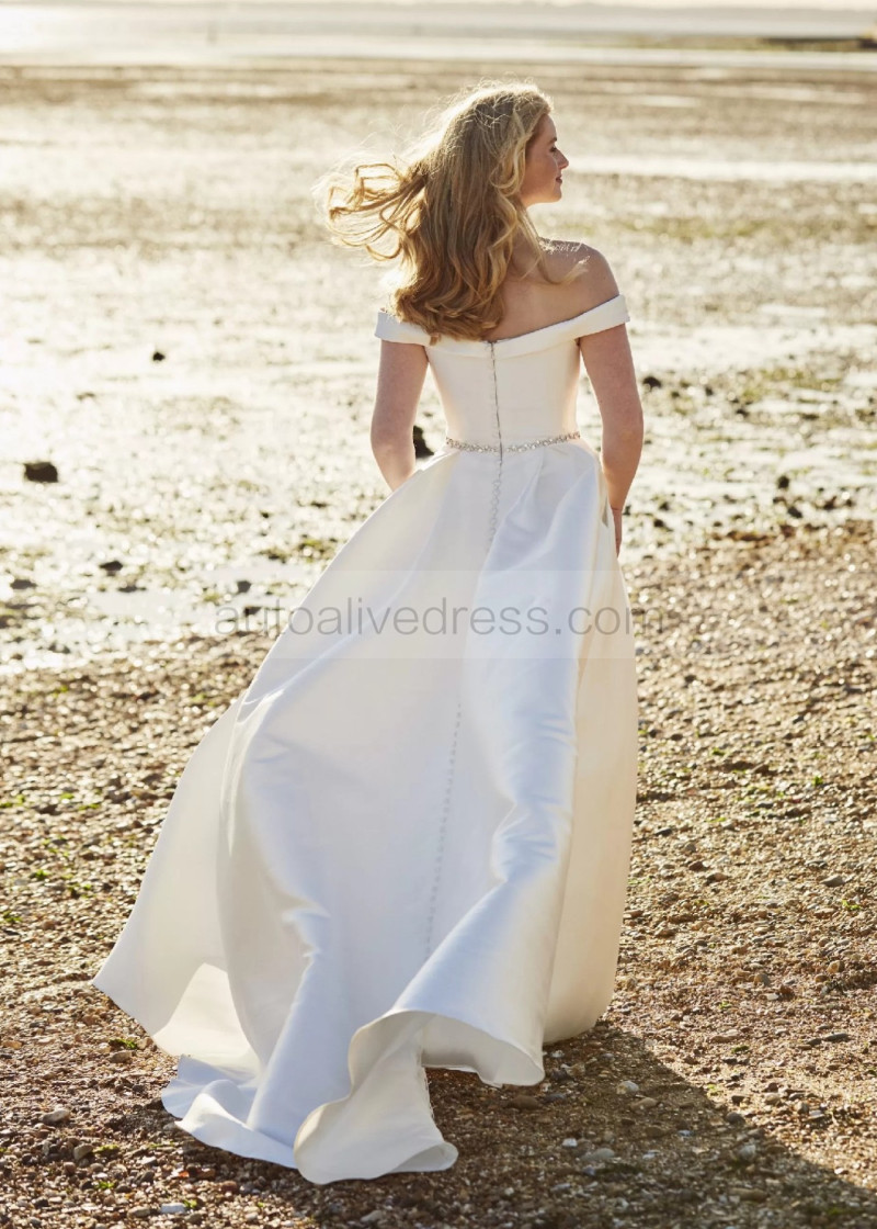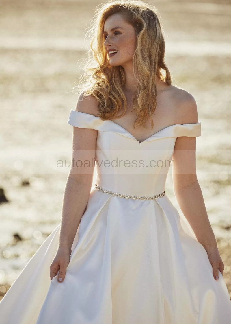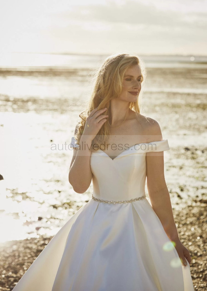Off Shoulder Ivory Satin Wedding Dress With Beaded Belt