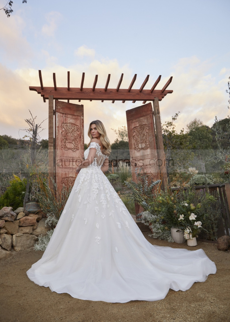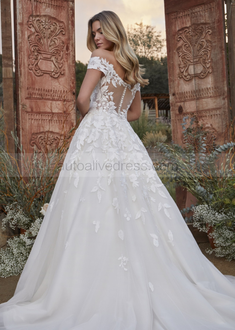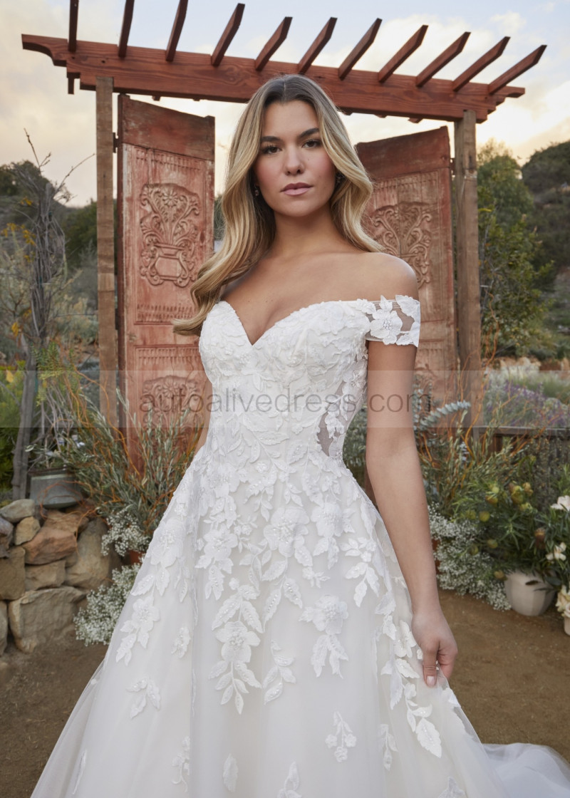 Off Shoulder Ivory Sequined Lace Tulle Illusion Back Wedding Dress