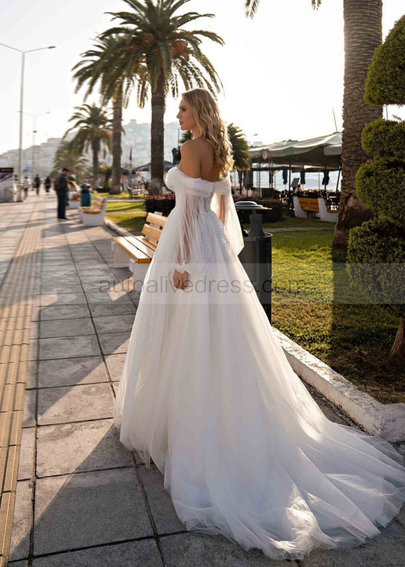 Off Shoulder Sparkly Ivory Lace Tulle Wedding Dress With Detachable Sleeves