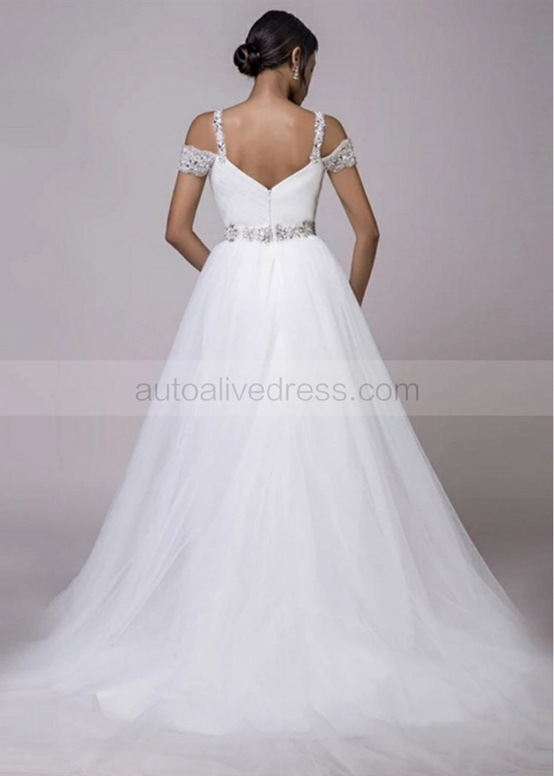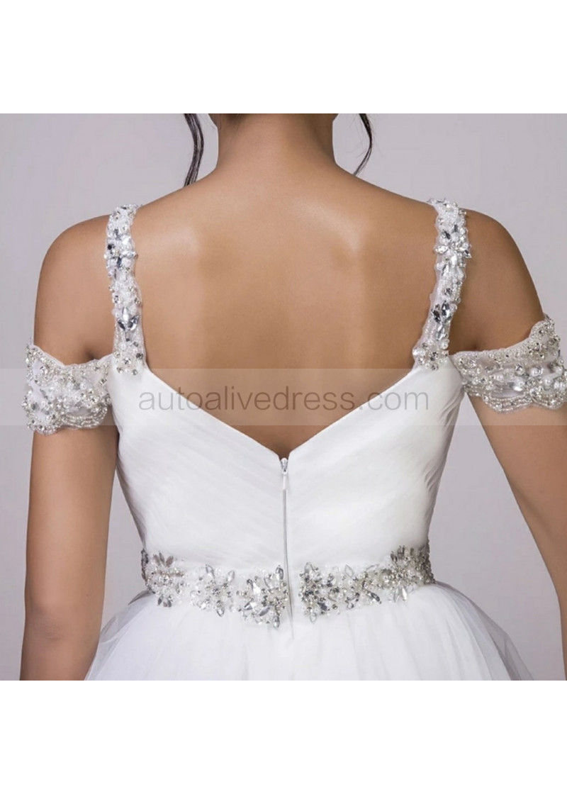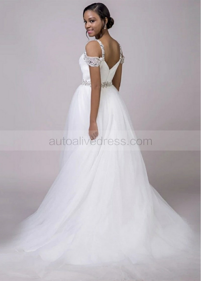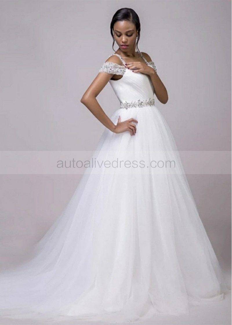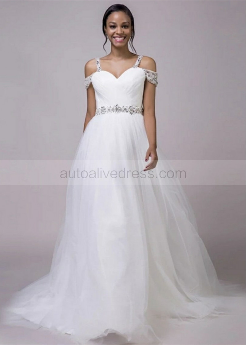 Off Shoulder Sweetheart Neck Beaded White Tulle Wedding Dress