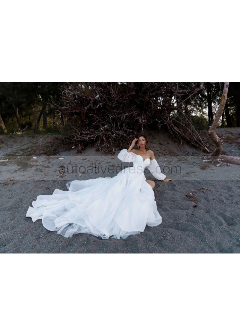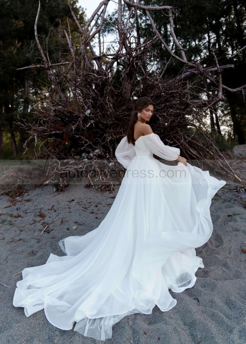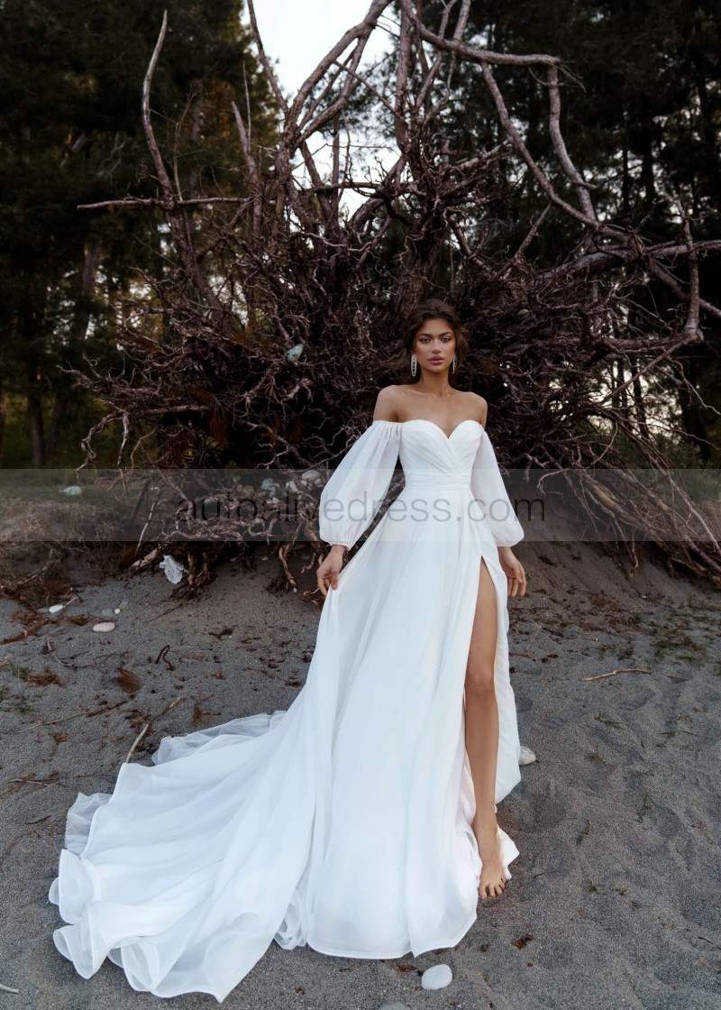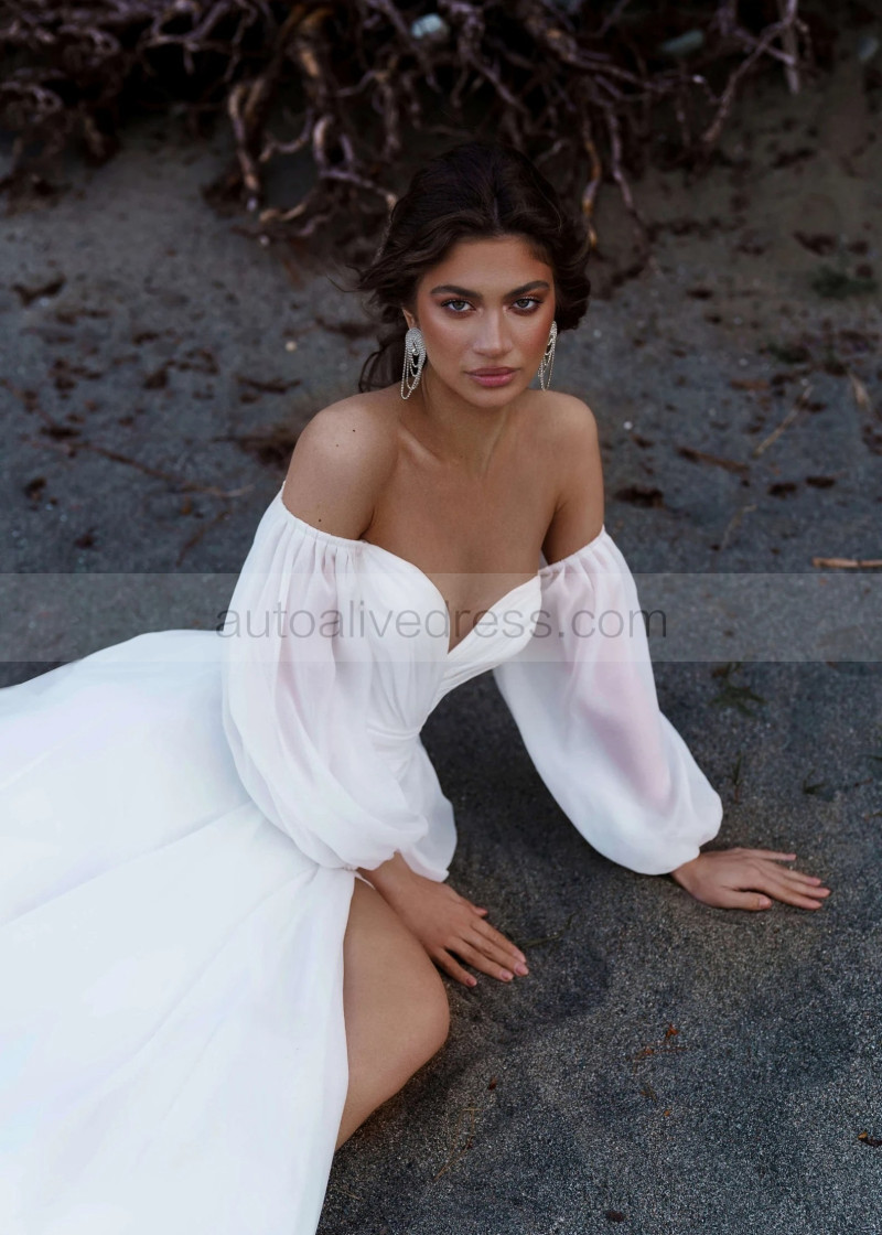 Off Shoulder White Chiffon Slit Boho Wedding Dress