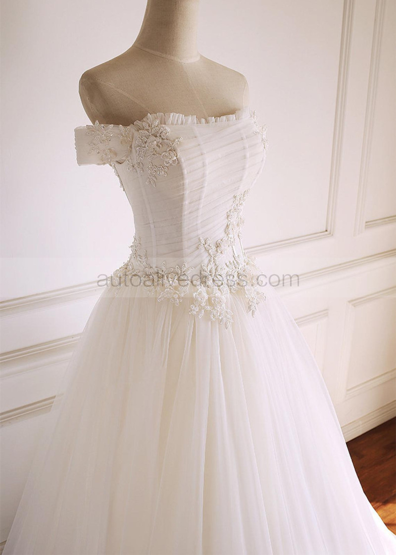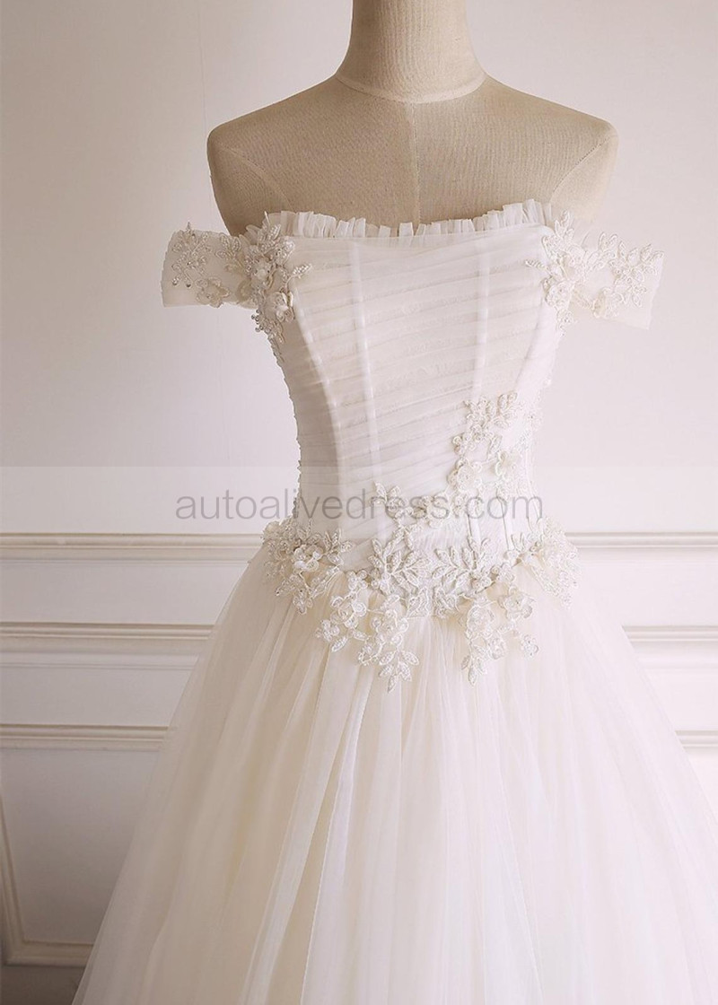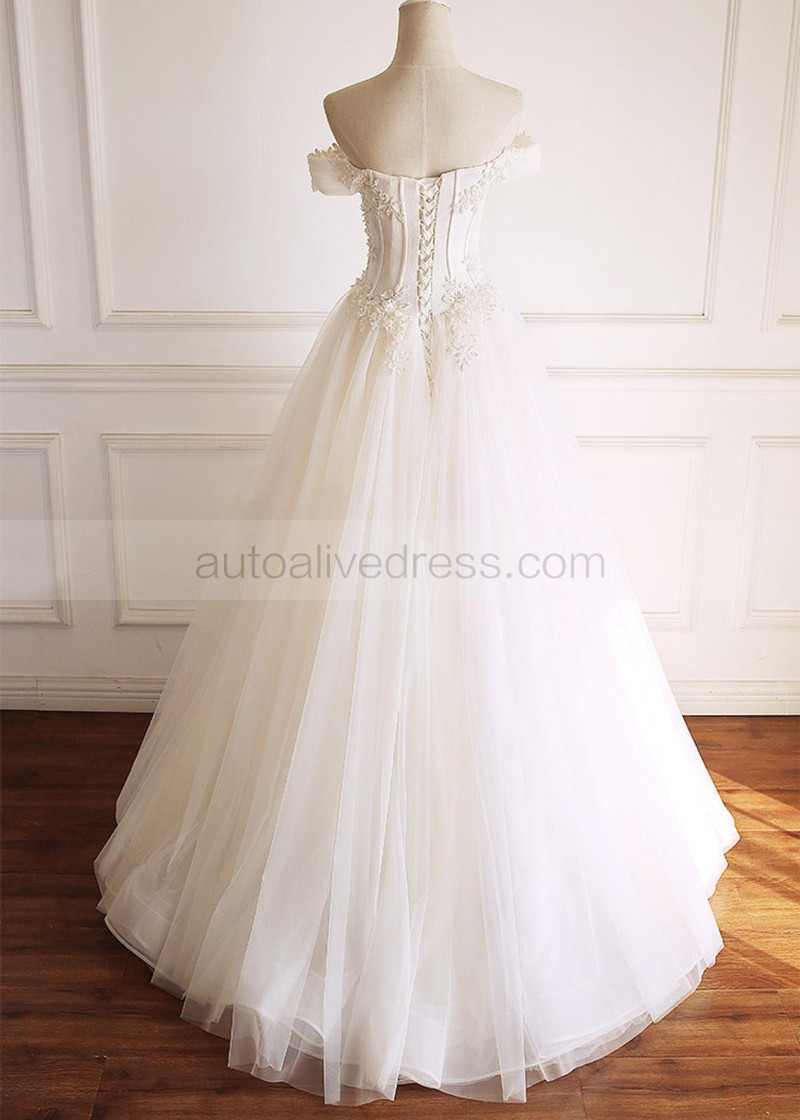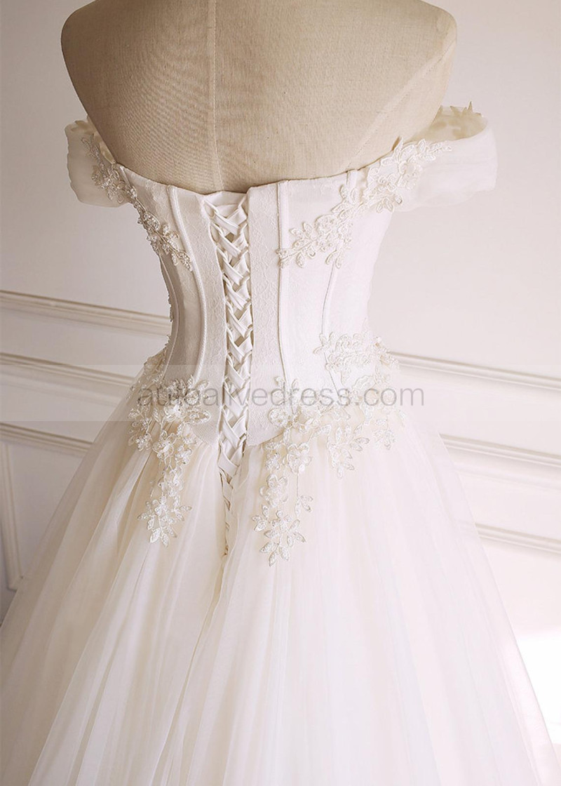 Off The Shoulder Ivory Lace Tulle Basque Waist Wedding Dress