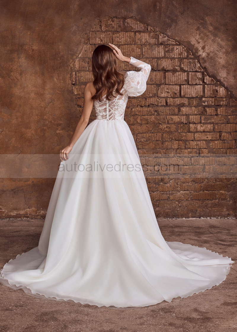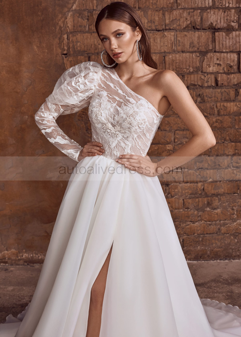 One Shoulder Ivory Lace Organza Slit Wedding Dress