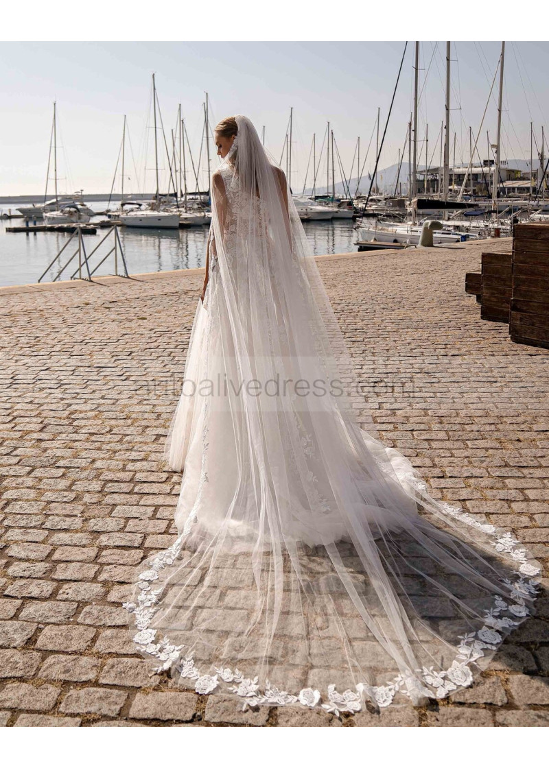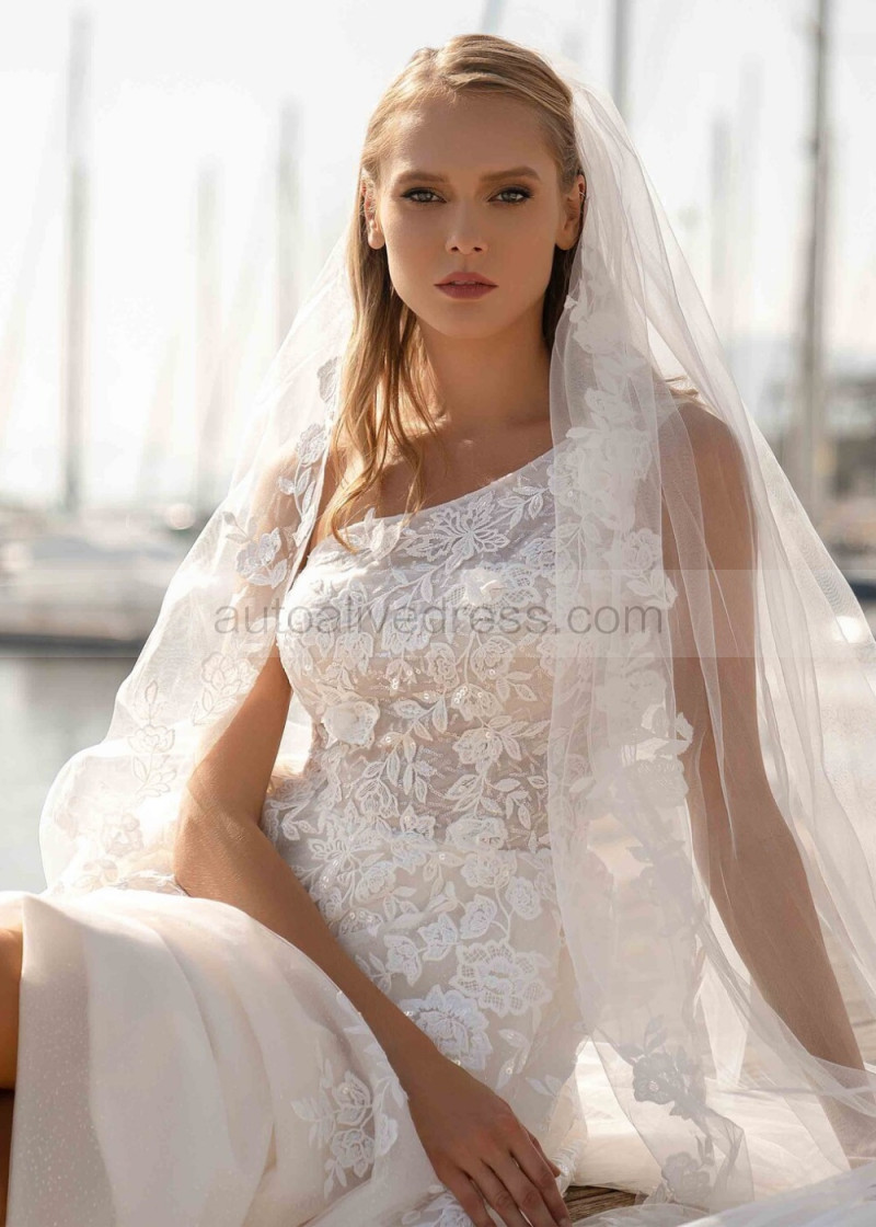 One Shoulder Ivory Lace Tulle Glitter Wedding Dress