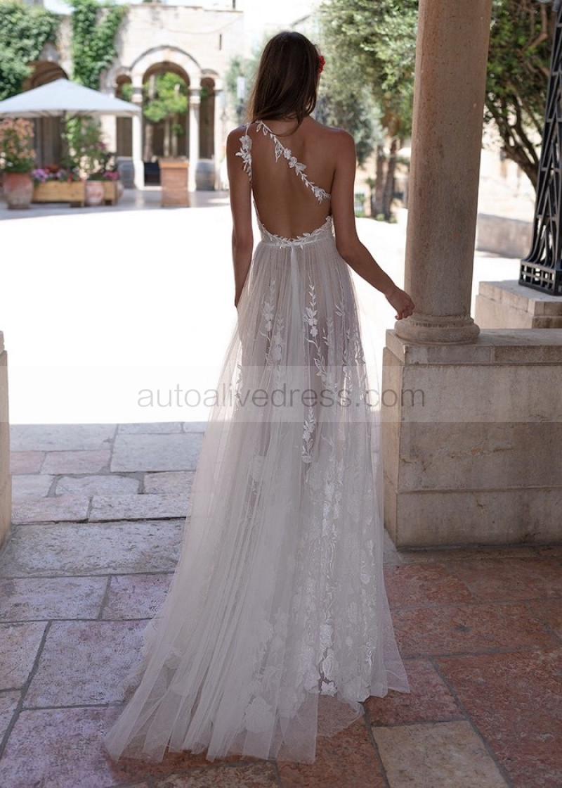 One Shoulder Ivory Lace Tulle Slit Open Back Wedding Dress