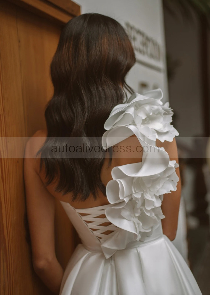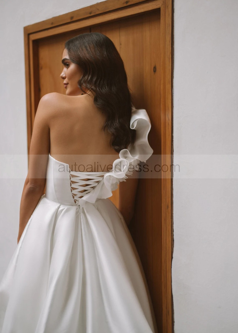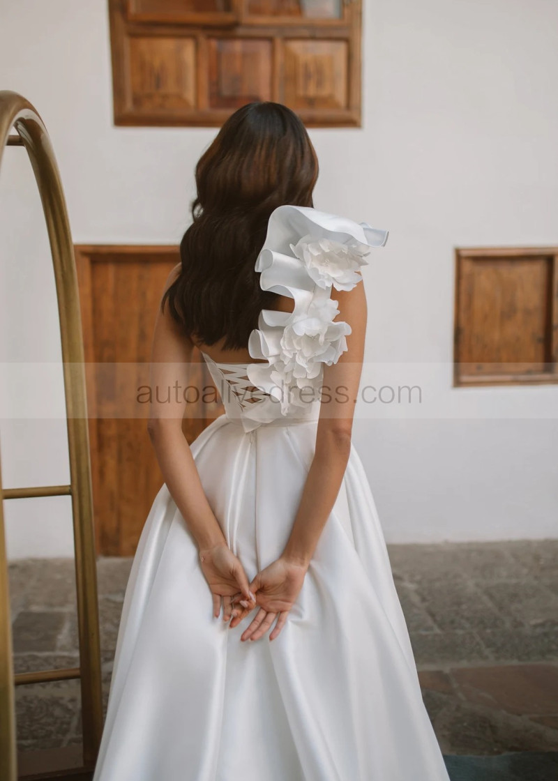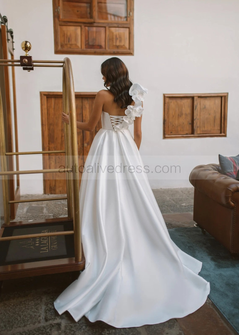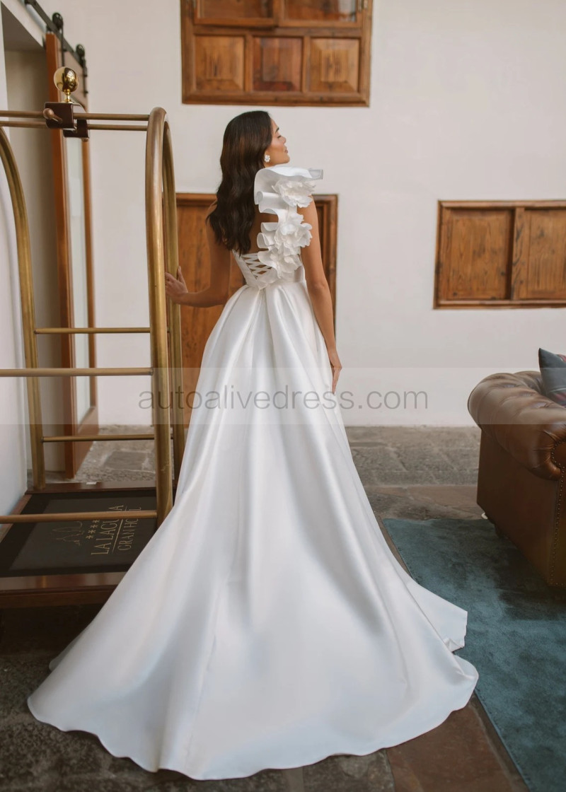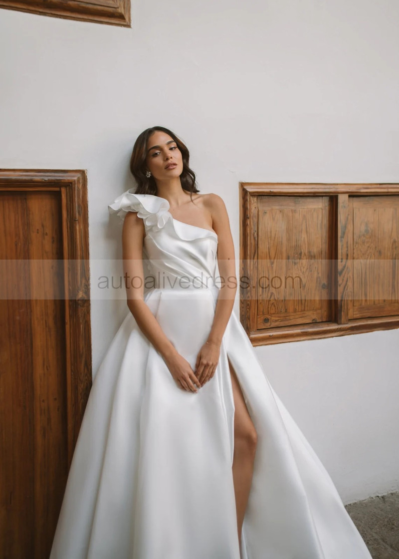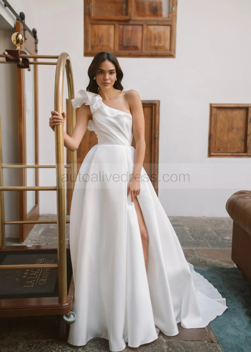 One Shoulder Ivory Satin Slit Timeless Wedding Dress