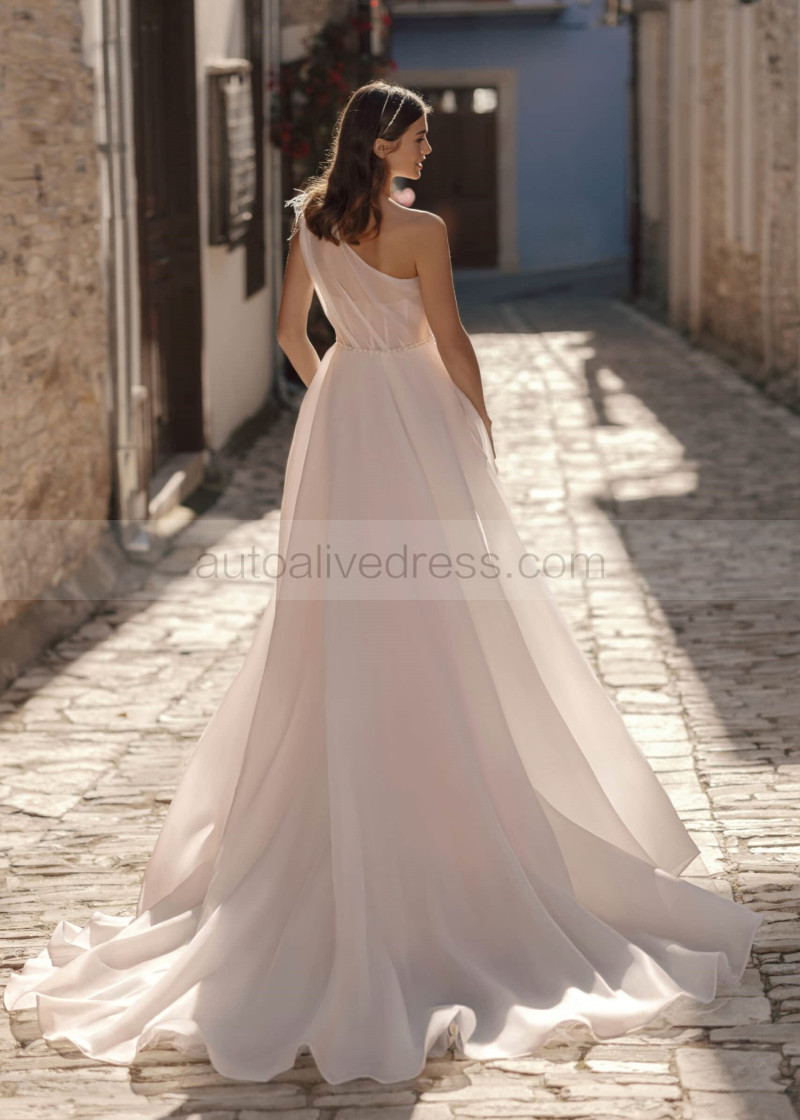 One Shoulder Light Pink Organza Lace Dreamy Wedding Dress