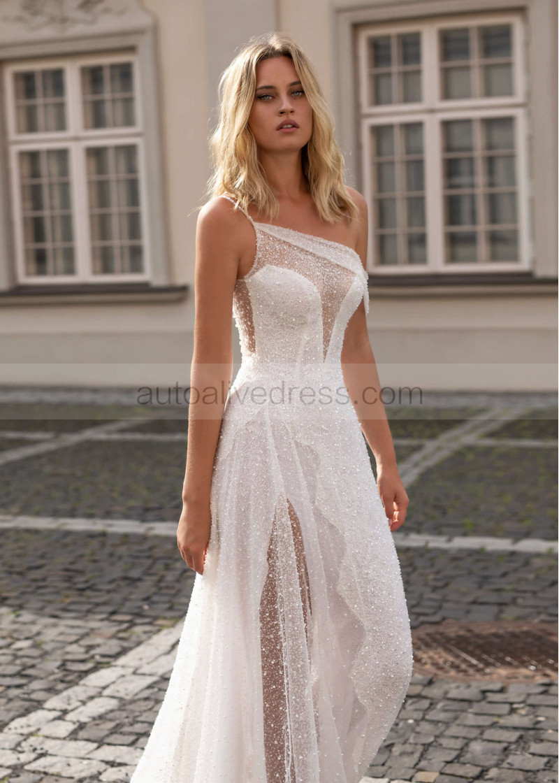 One Shoulder Sequins Pearls Slit Wedding Dress