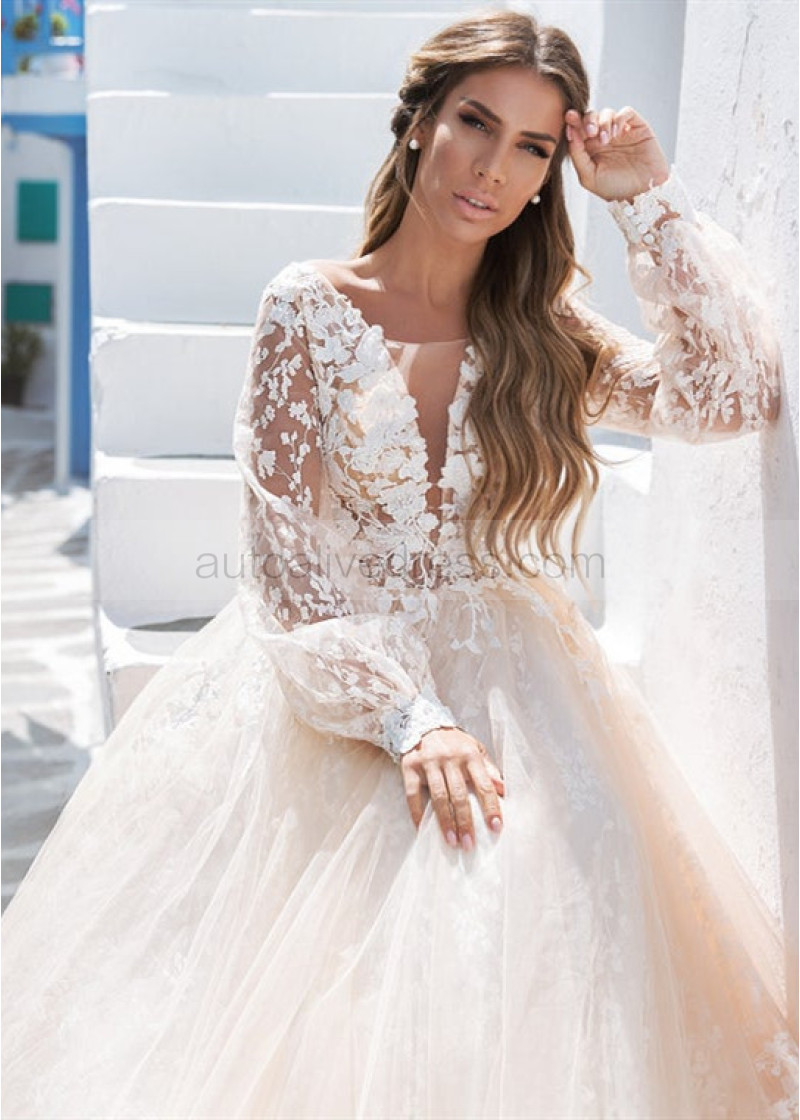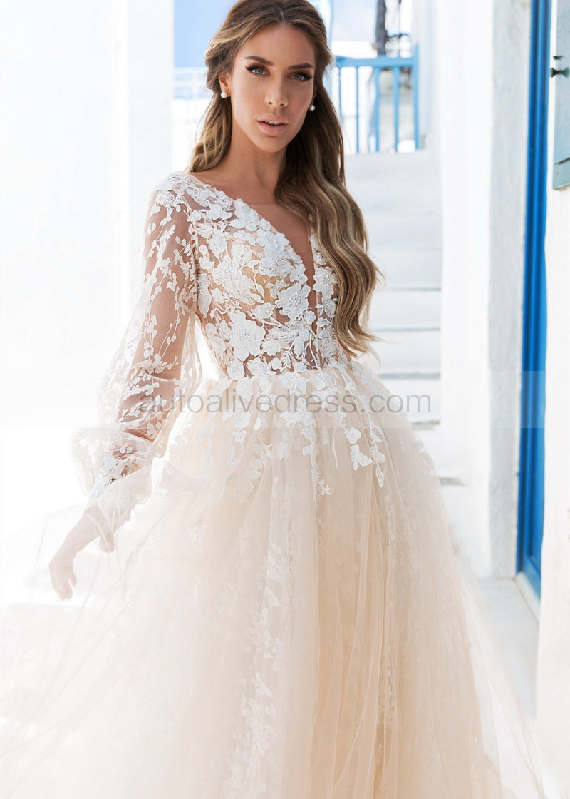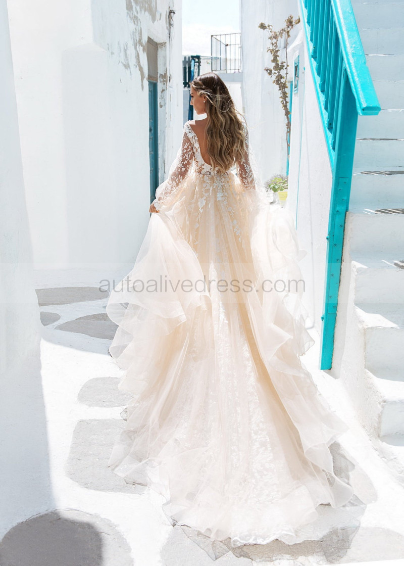 Pearl Embellished Ivory Lace Champagne Tulle Bohemian Wedding Dress