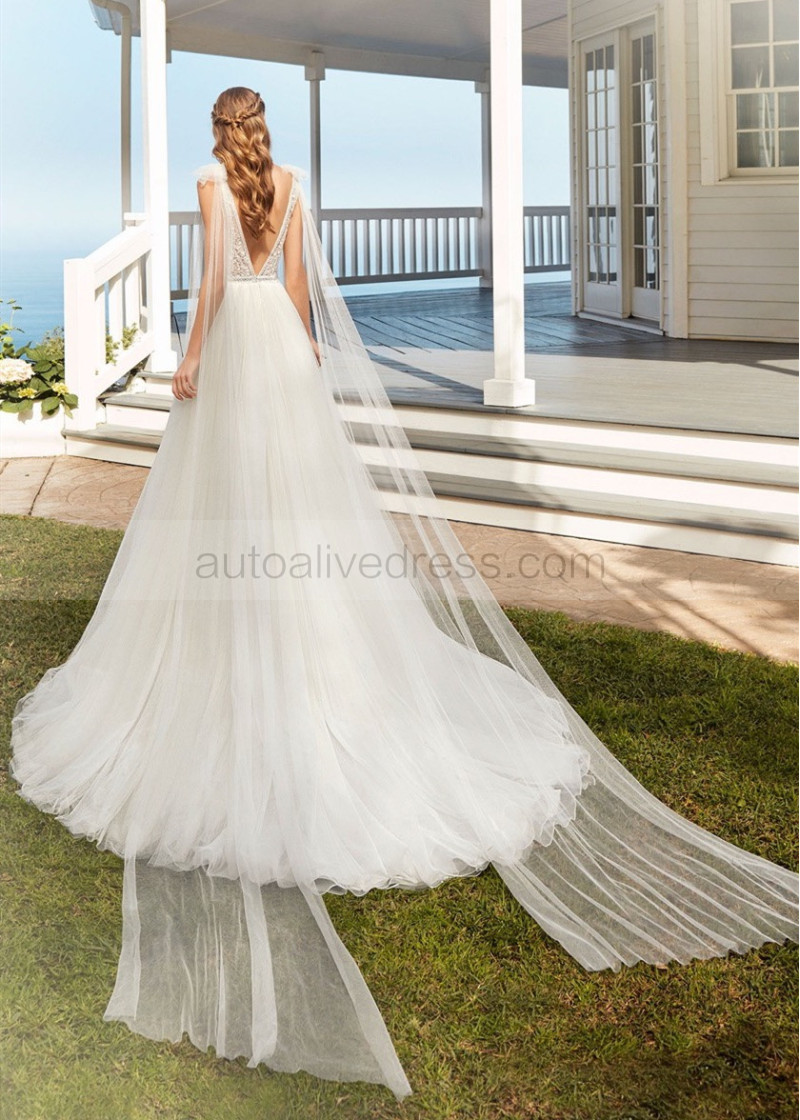 Plunging Neck Beaded Ivory Lace Tulle Wedding Dress