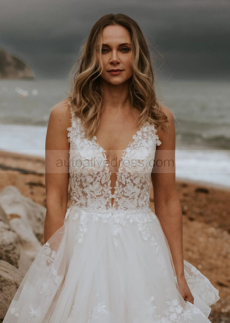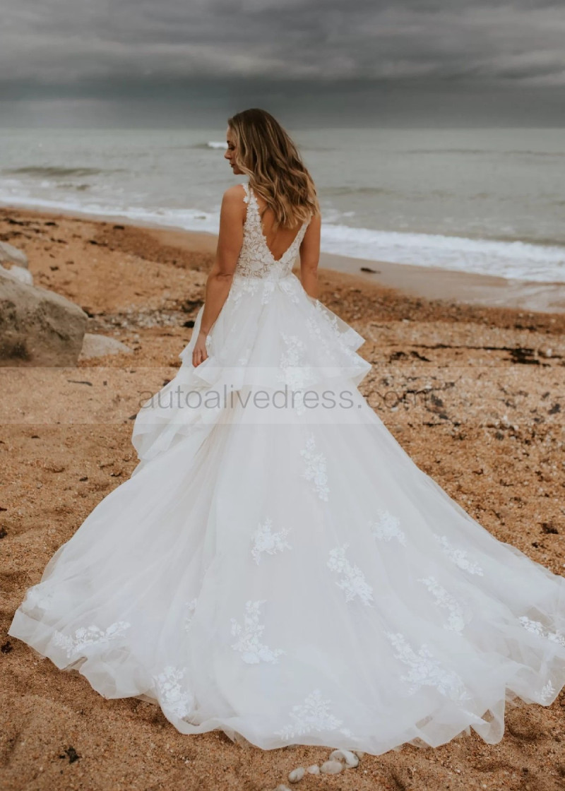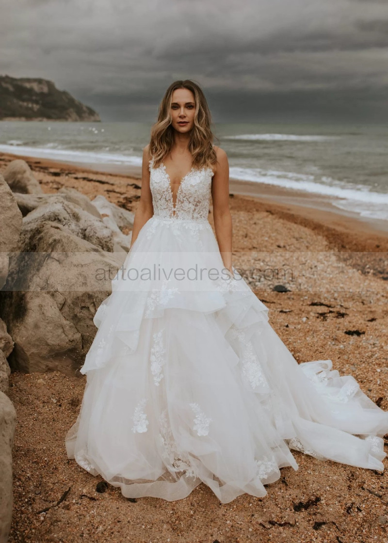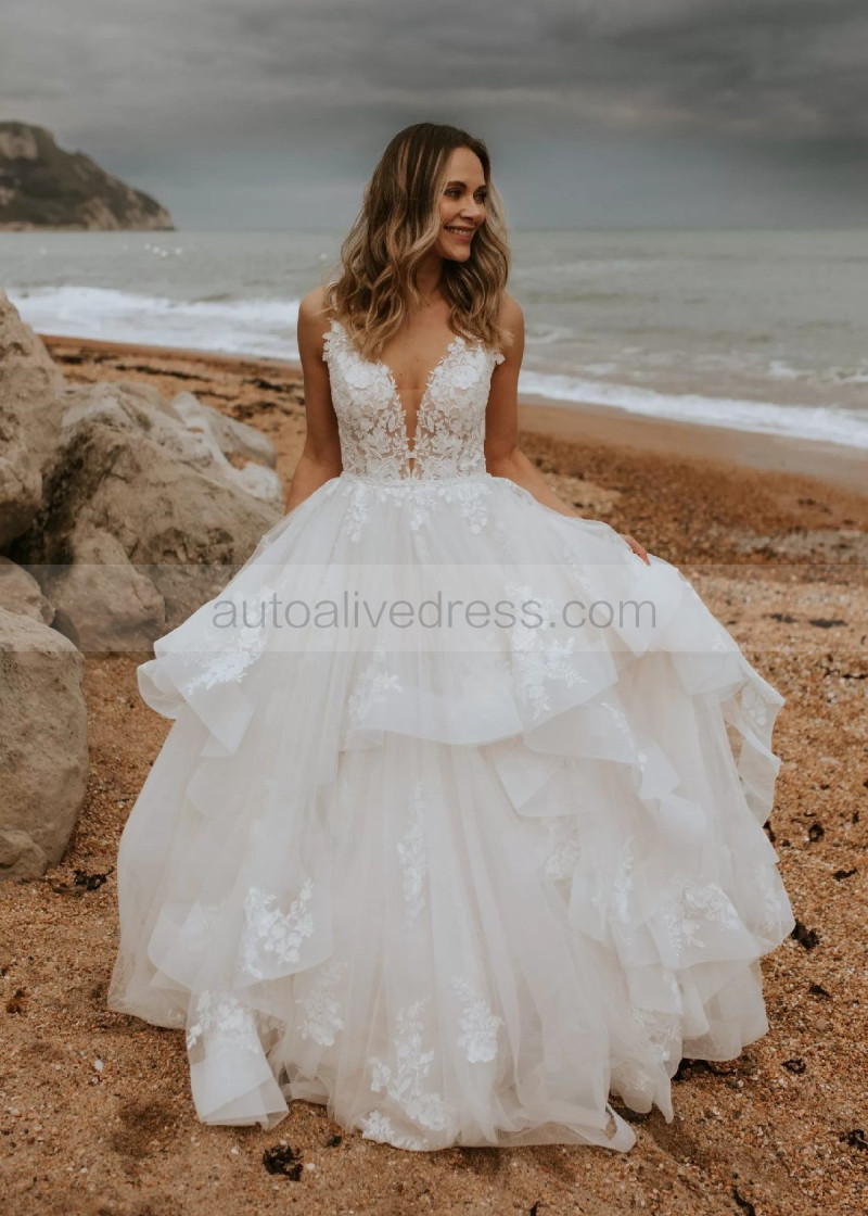 Plunging Neck Ivory Lace Tulle Ruffled Wedding Dress