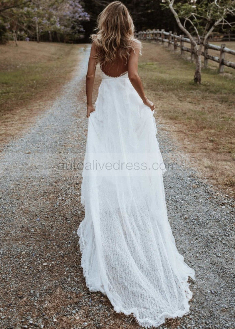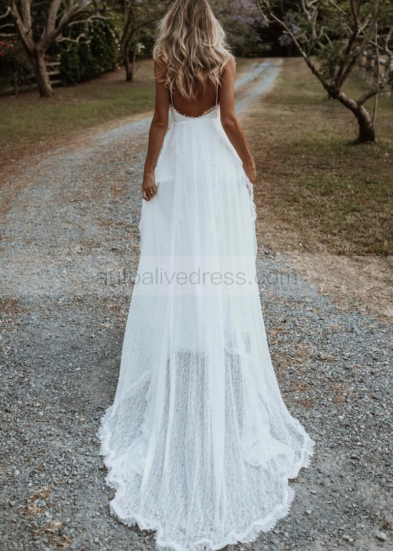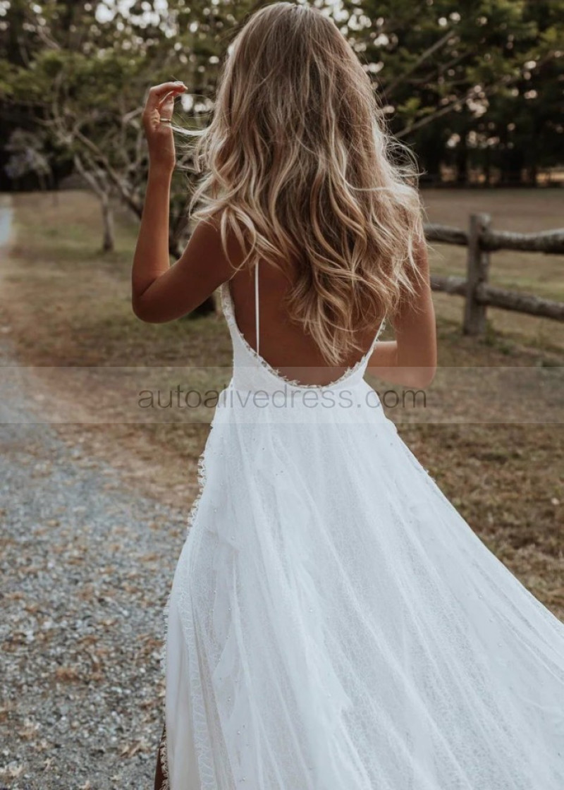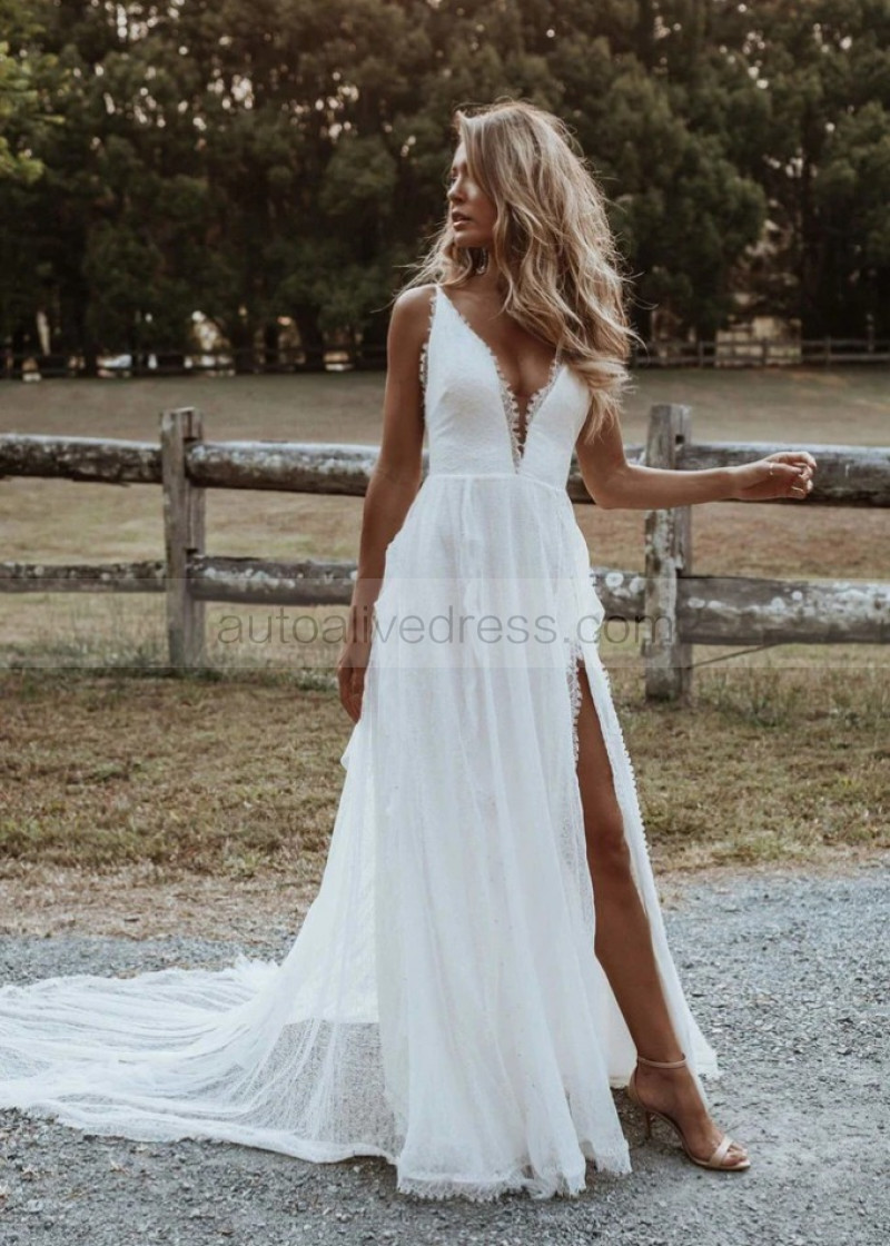 Plunging Neck Ivory Lace Tulle Slit Romantic Wedding Dress