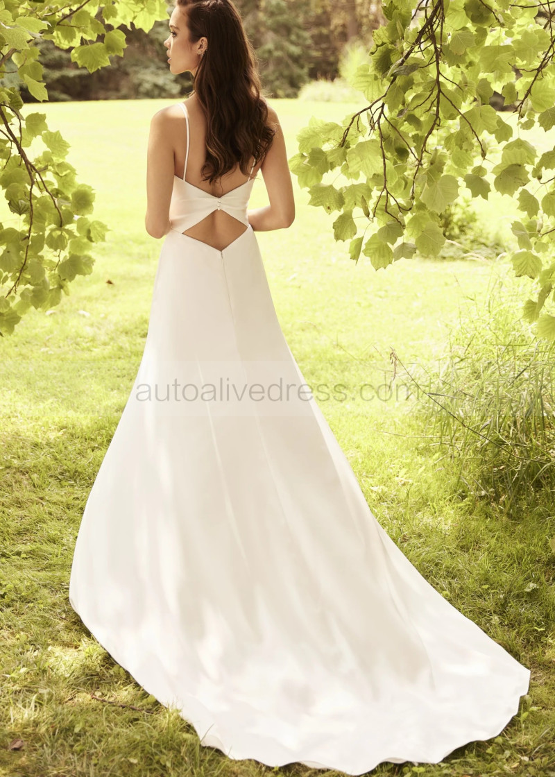 Plunging Neck Ivory Pleated Satin Open Back Simple Wedding Dress