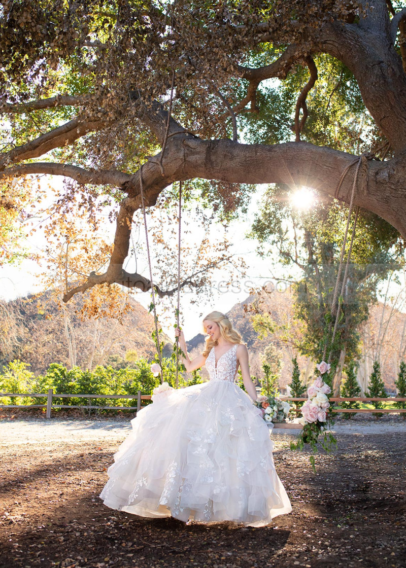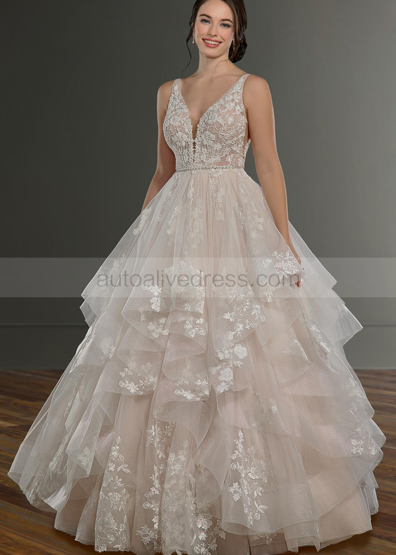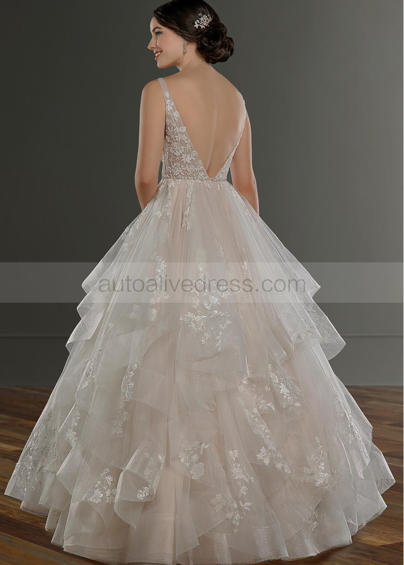 Plunging V Neck Beaded Ivory Lace Tulle Ruffle Deep V Back Wedding Dress
