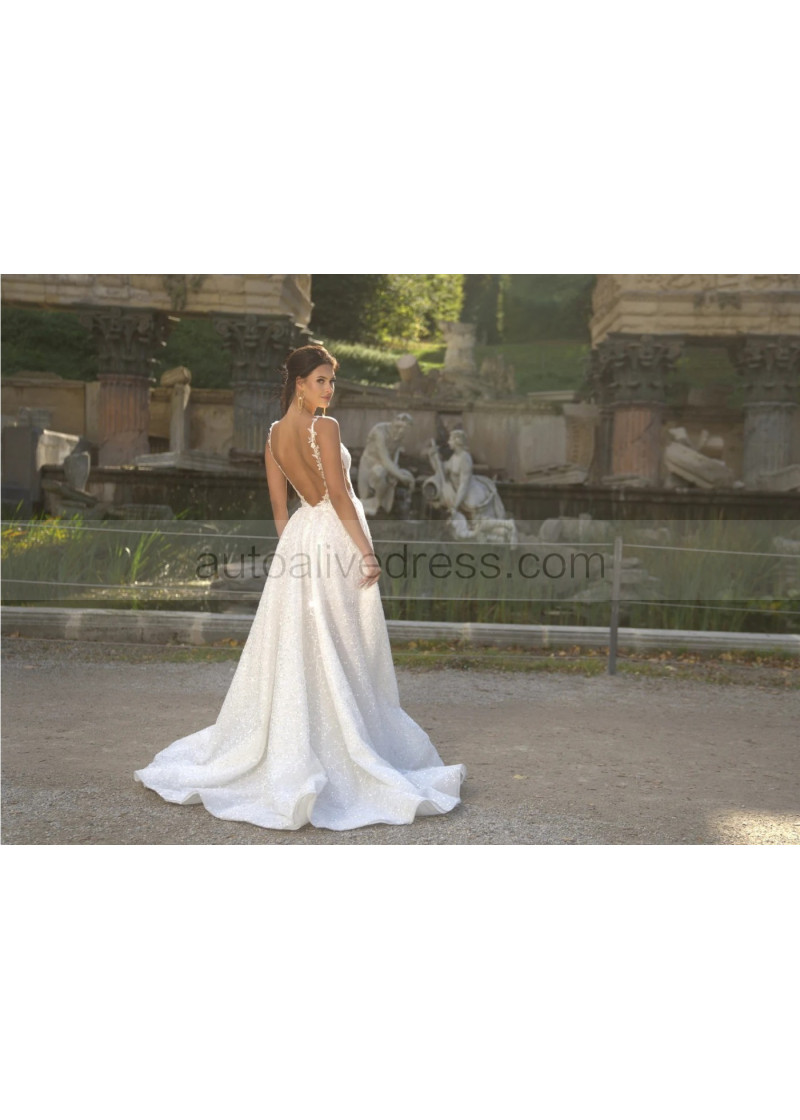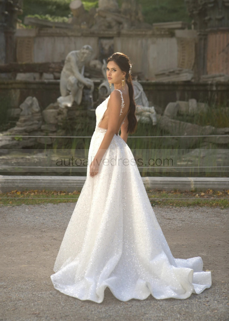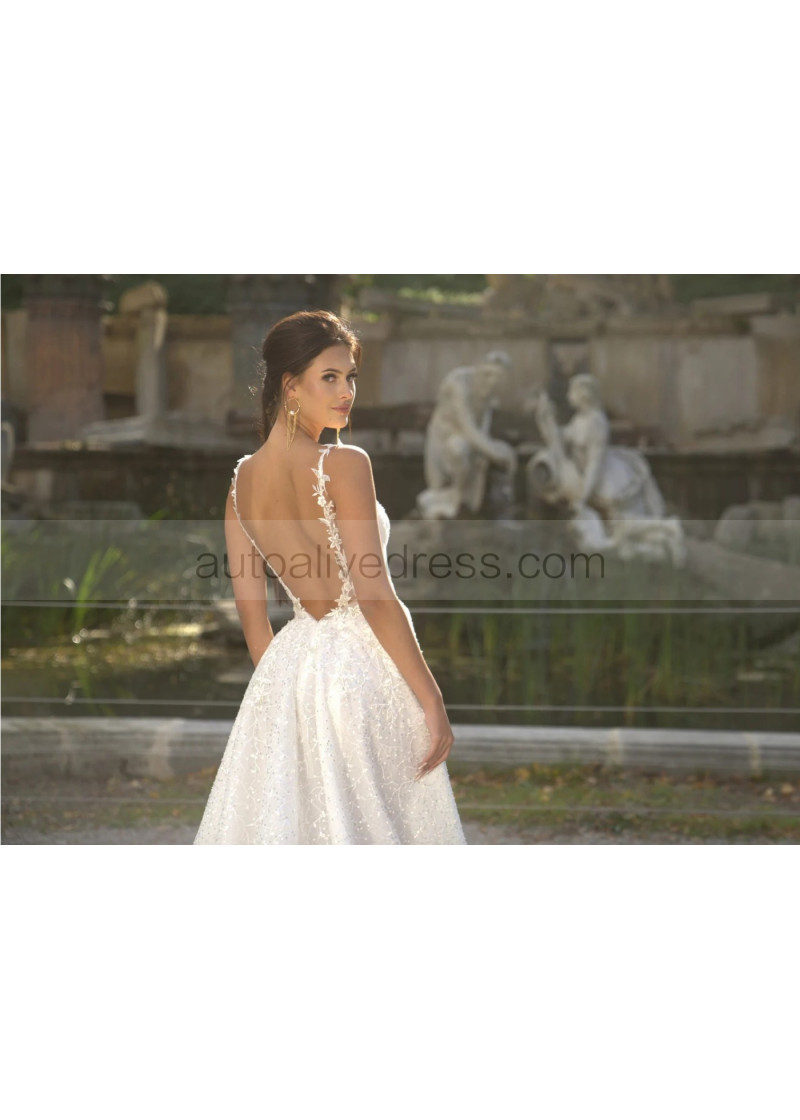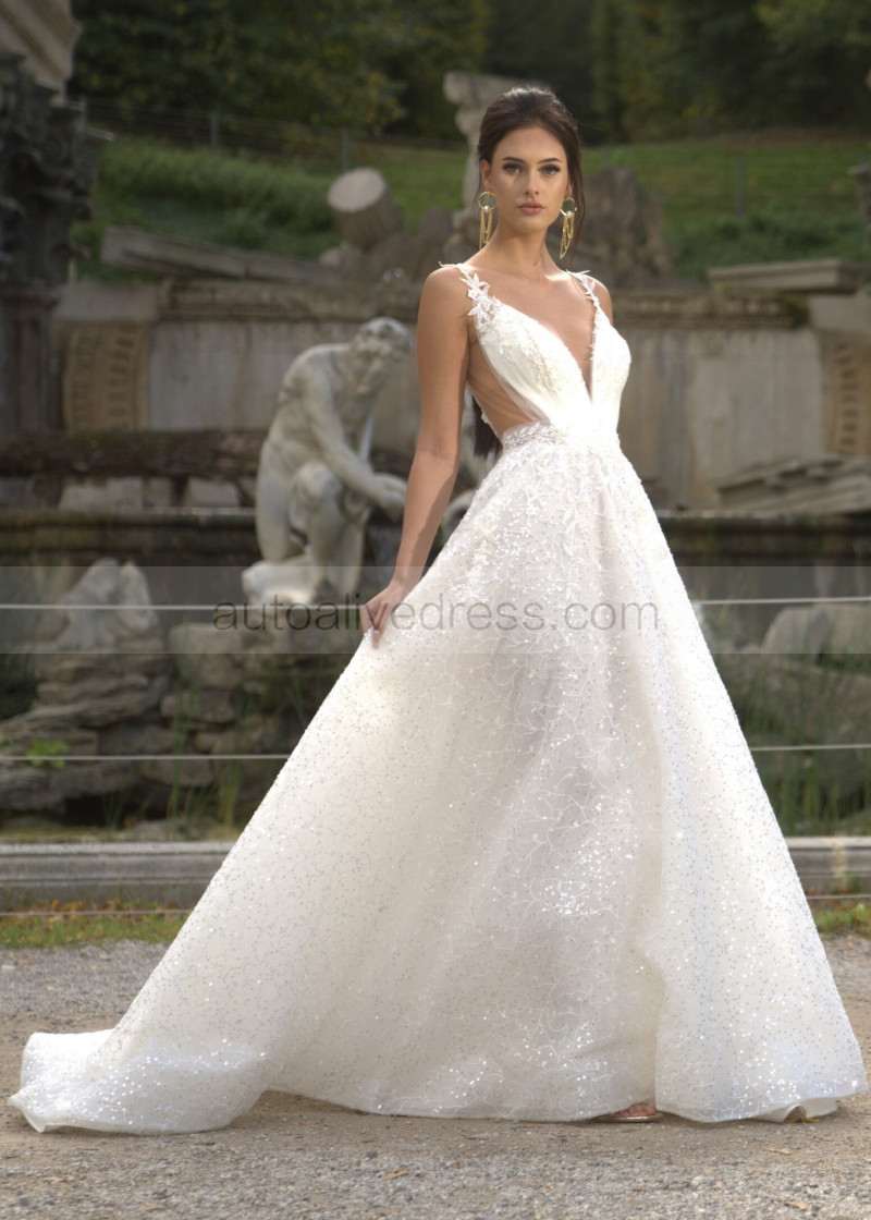 Plunging V Neck Beaded Ivory Lace Tulle Sexy Wedding Dress