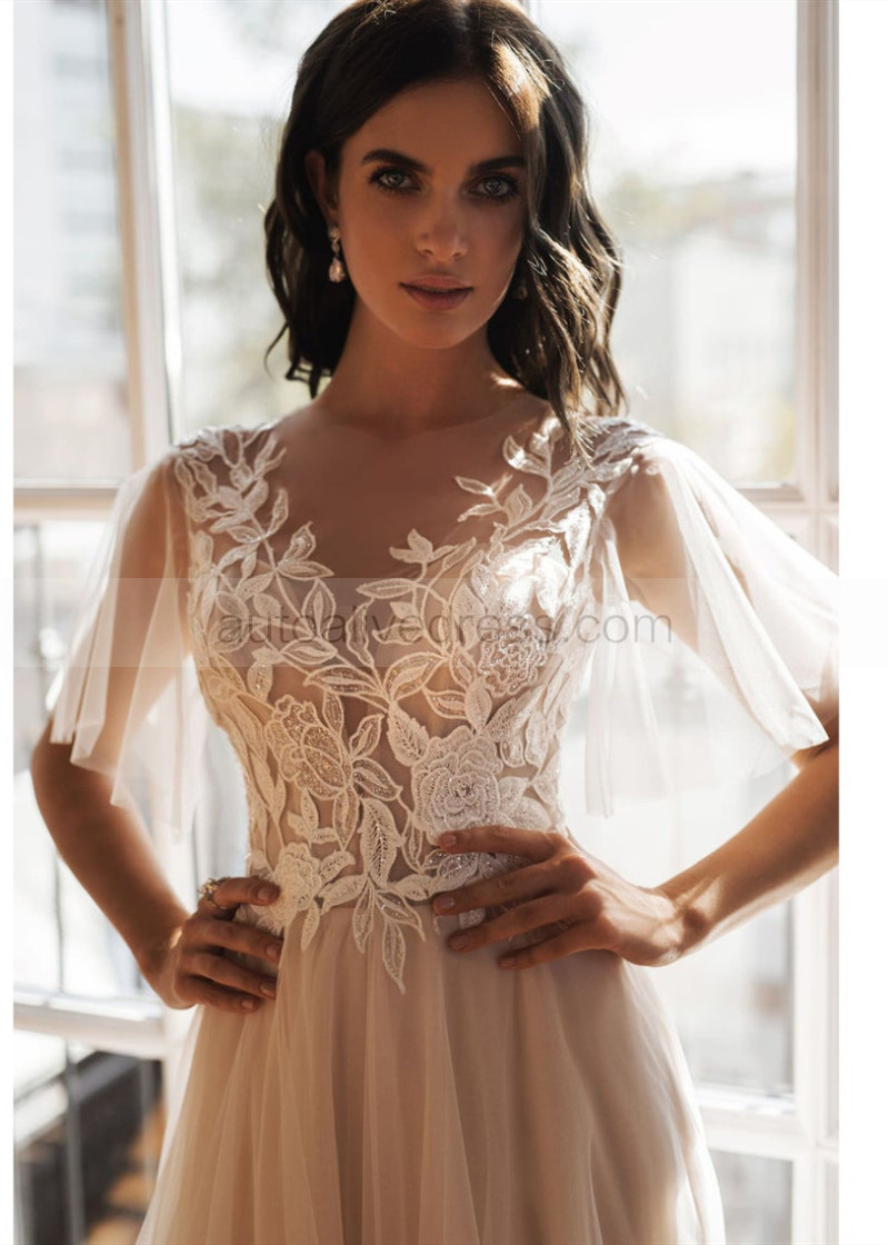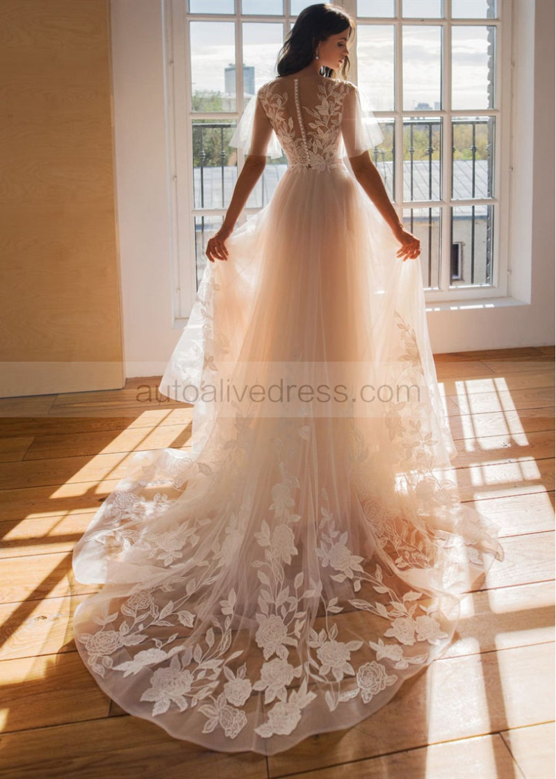 Puff Sleeve Ivory Lace Tulle Wedding Dress