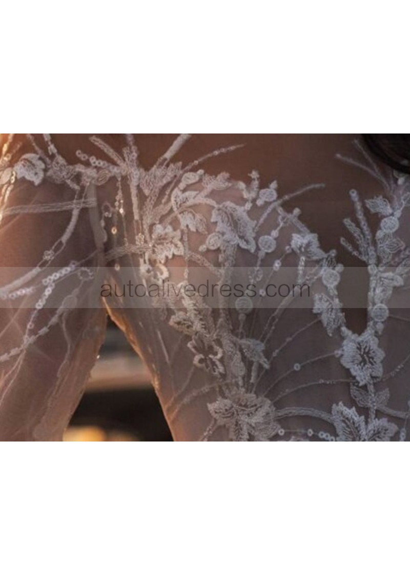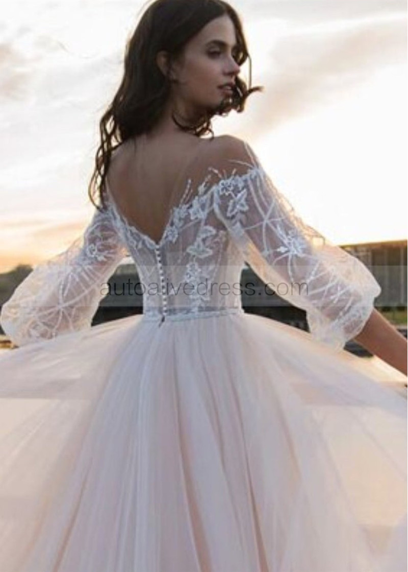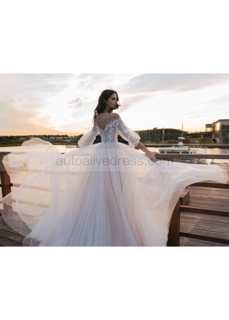 Puff Sleeve Ivory Sequined Lace Tulle Wedding Dress