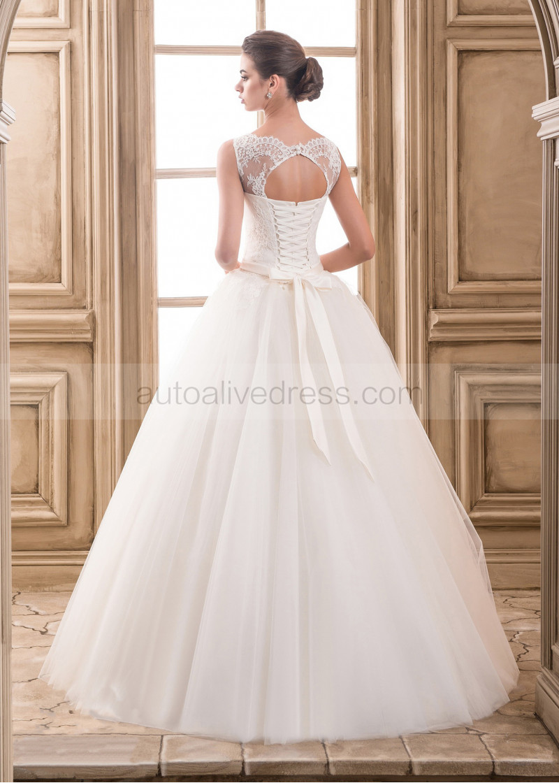 Sabrina Neckline Ivory Lace Tulle Keyhole Back Wedding Dress