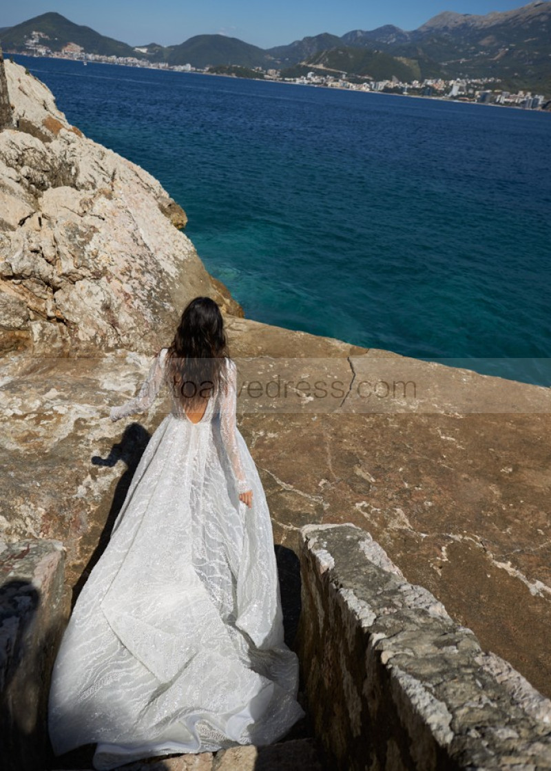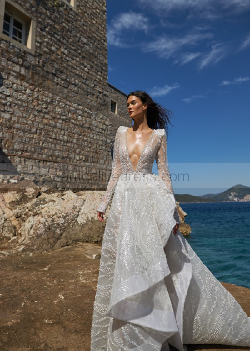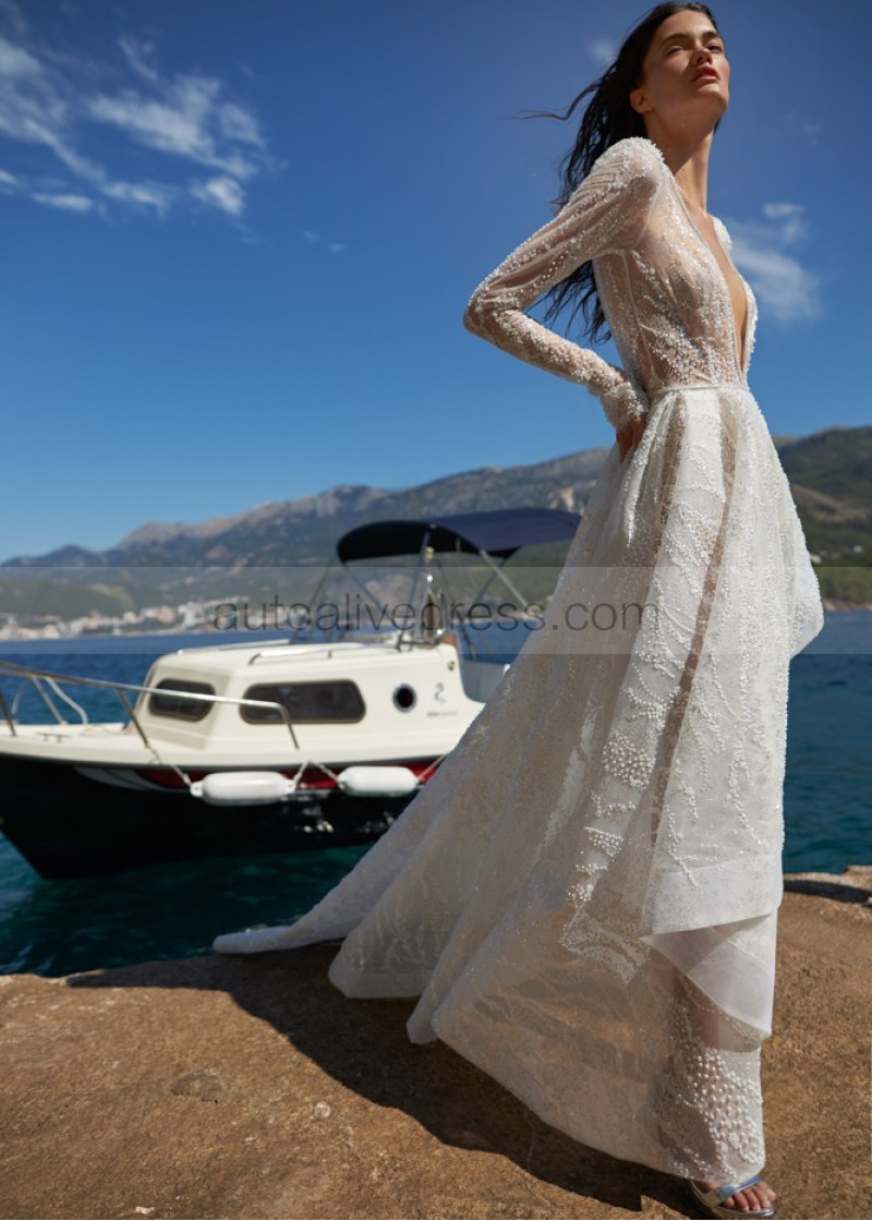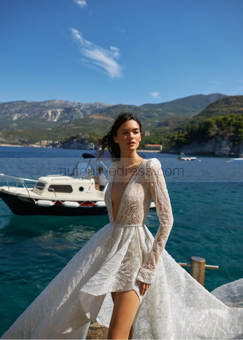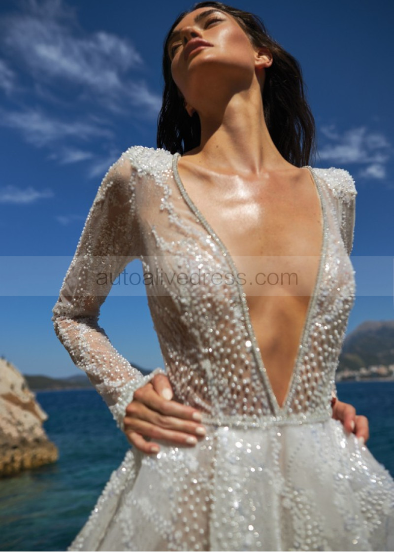 Sexy Deep V Neck Beaded Ivory Lace Wedding Dress