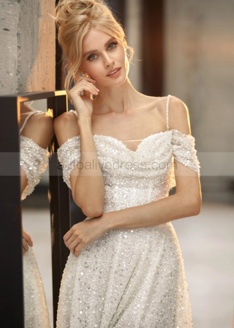 Sexy Ivory Glitter Lace High Slit Wedding Dress