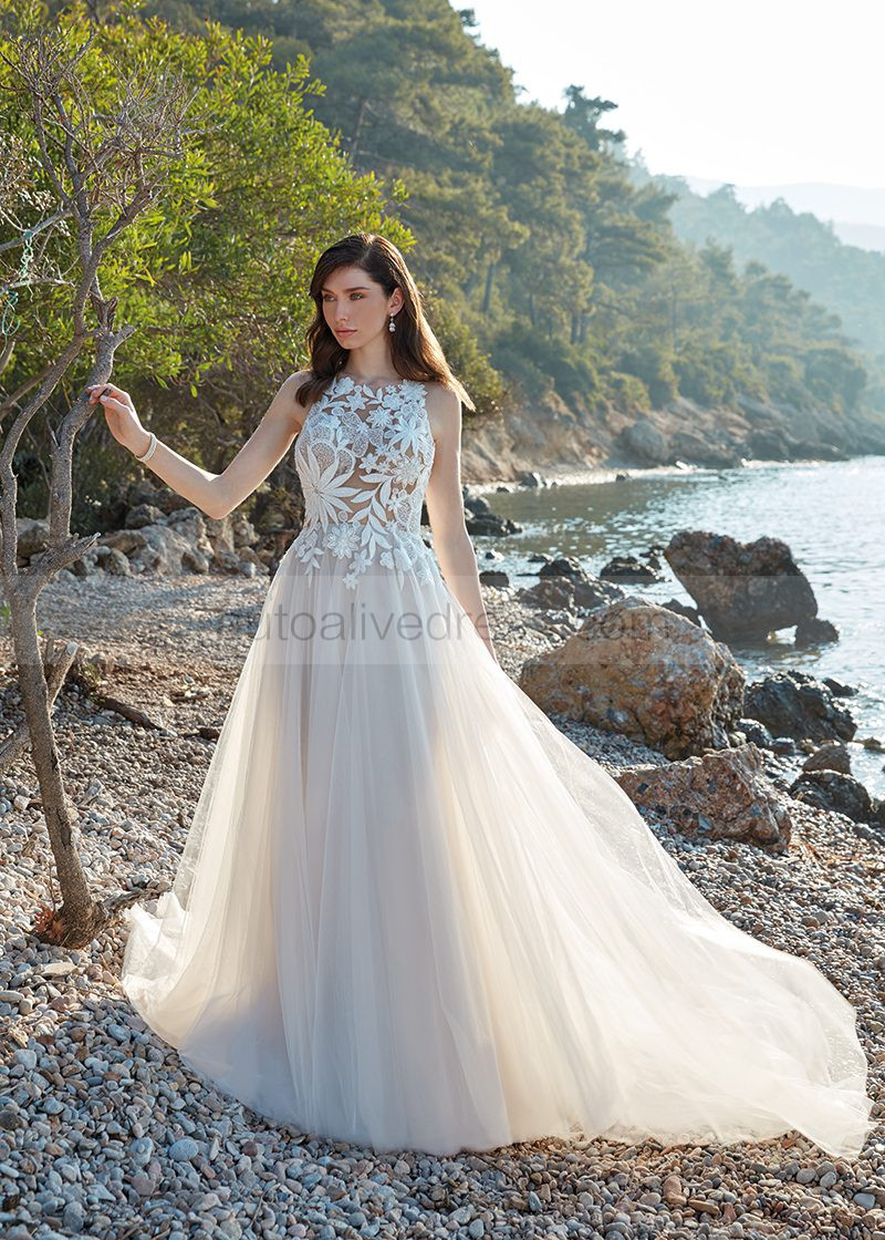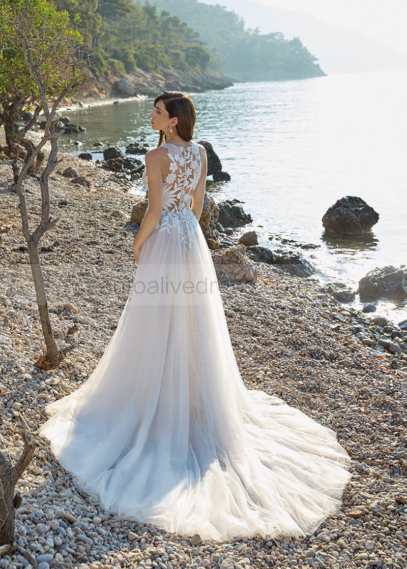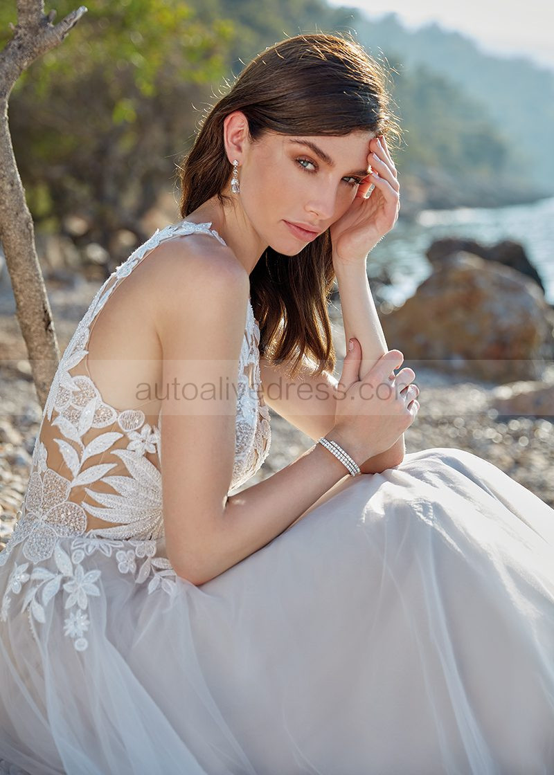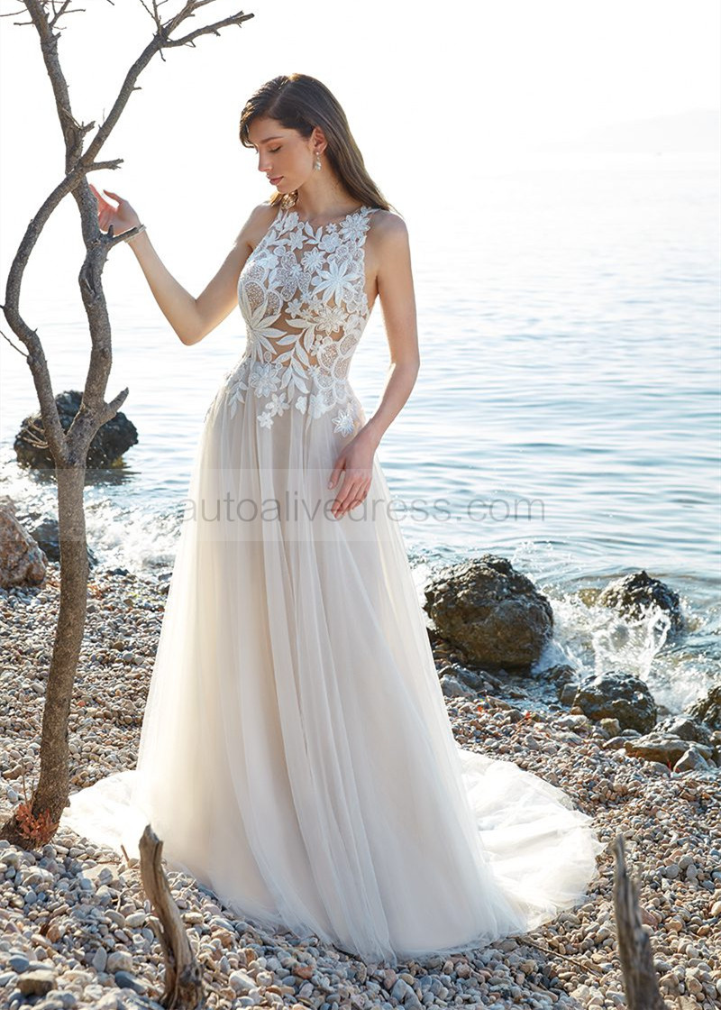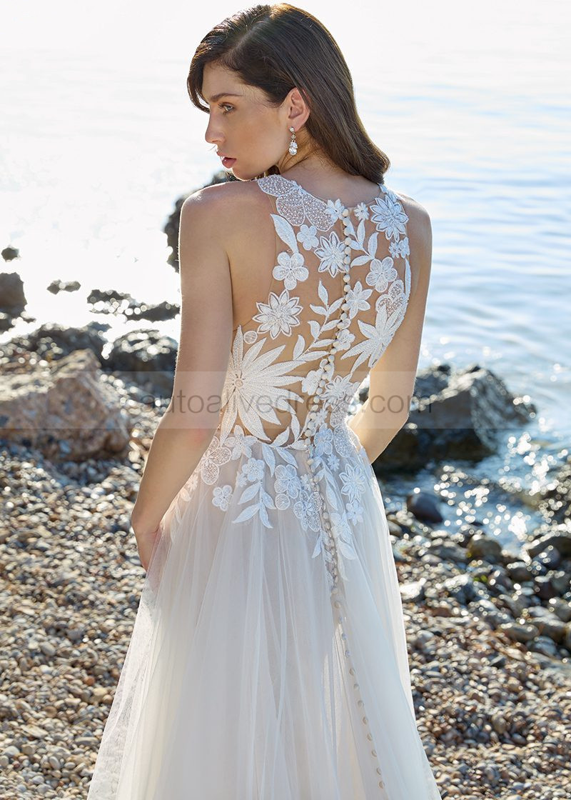 Sheer Boho Beach Beaded Lace Tulle Summer Airy Wedding Dress