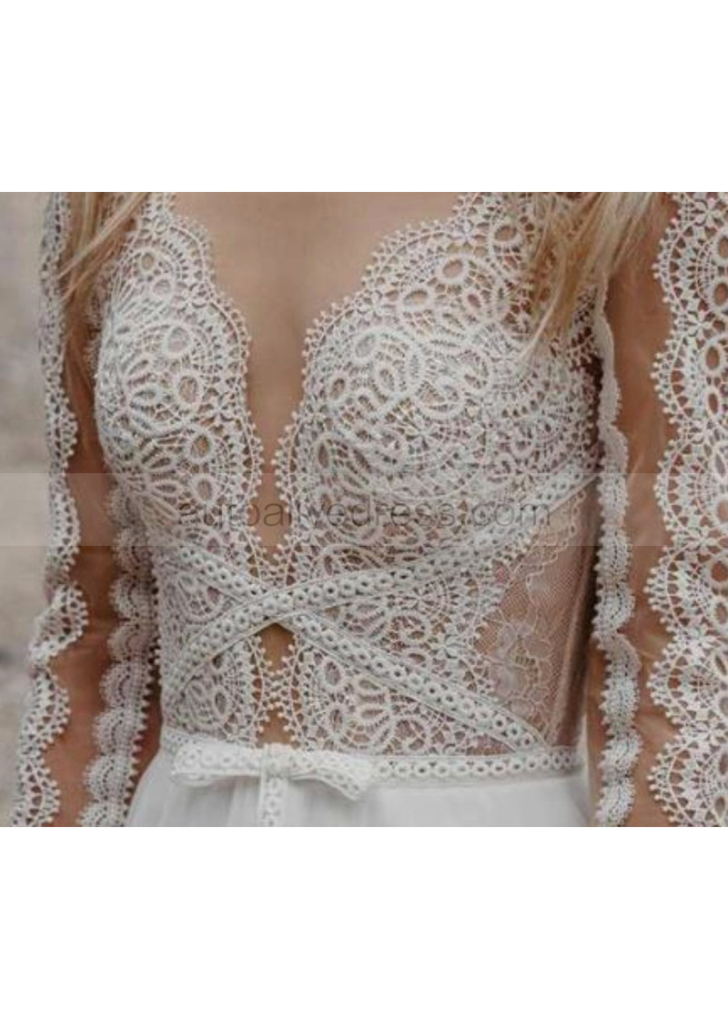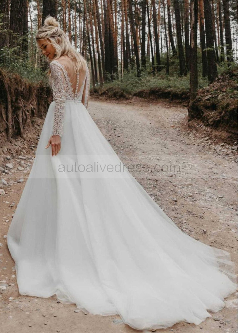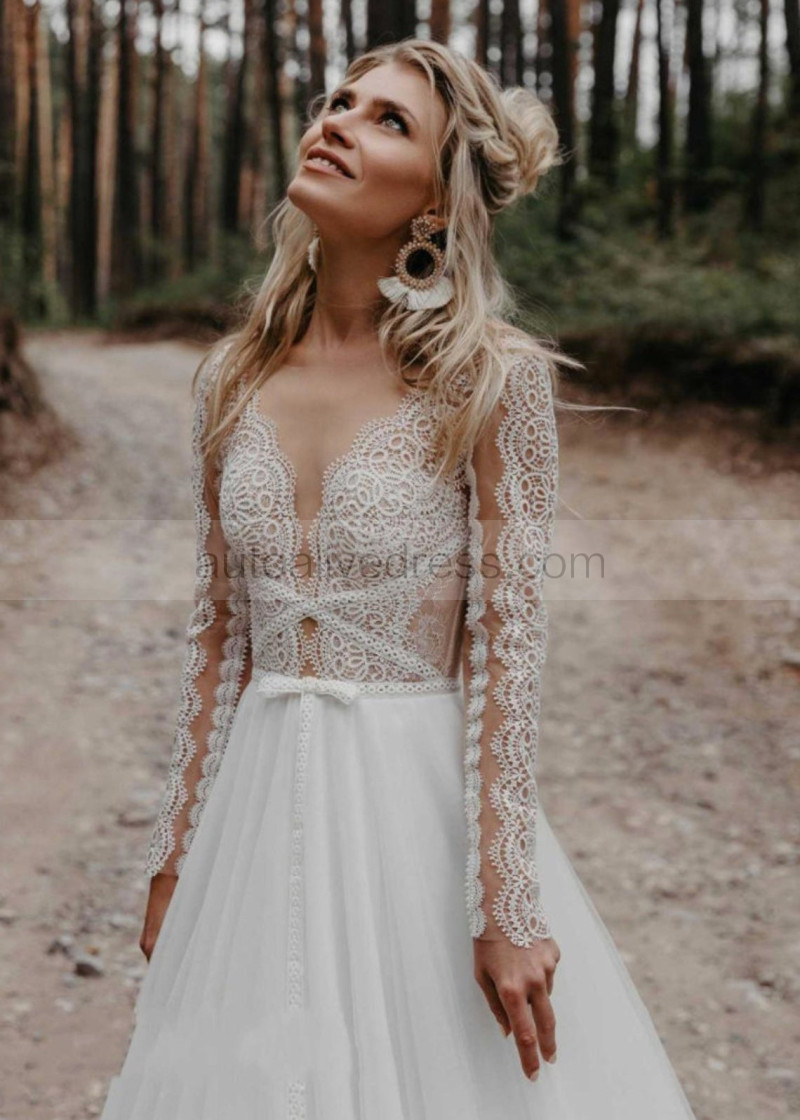 Sheer Long Sleeve Ivory Lace Tulle Boho Wedding Dress