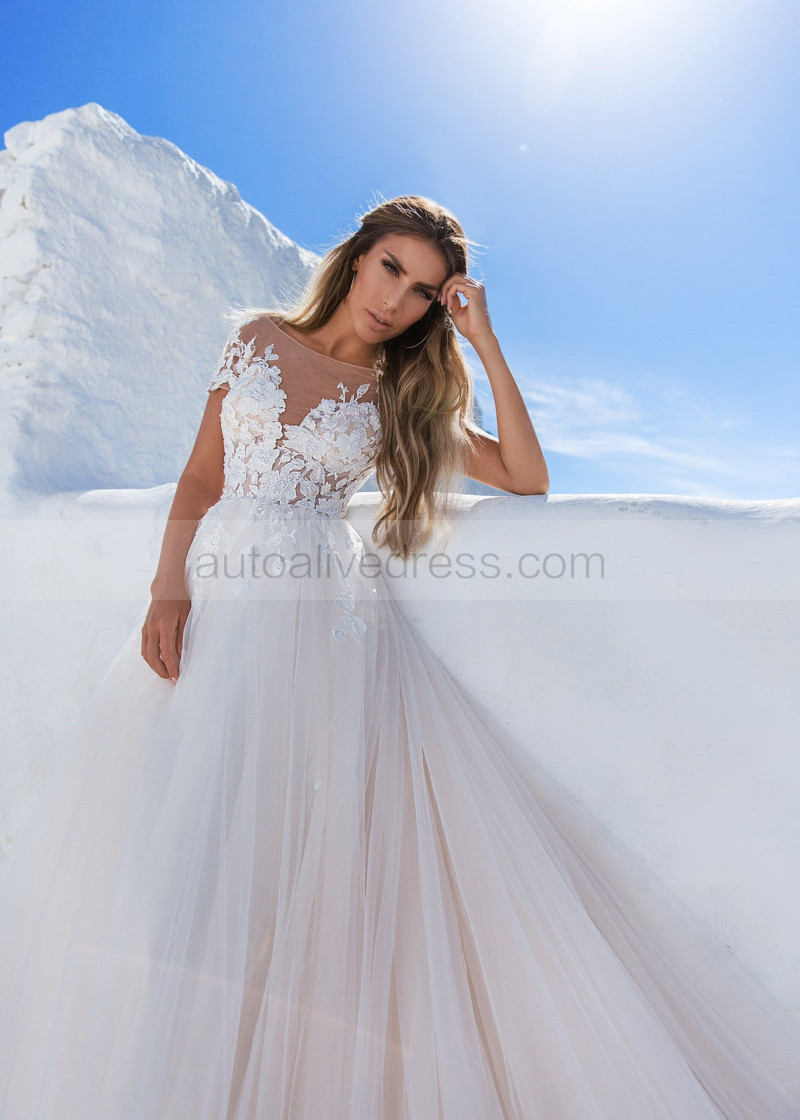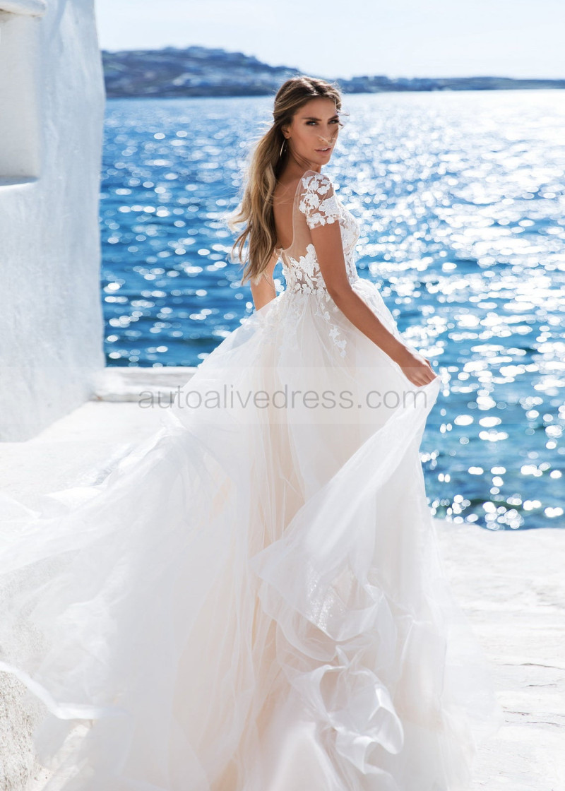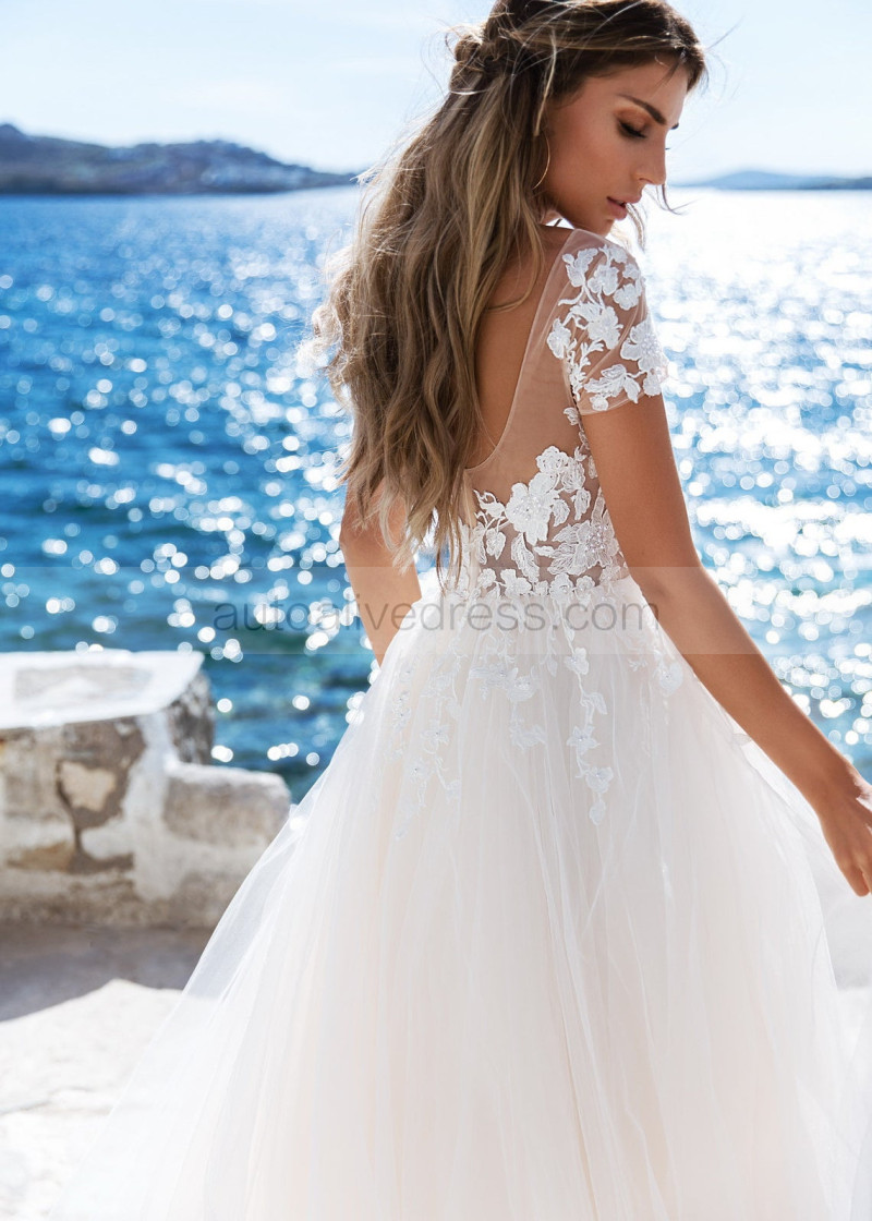 Short Sleeve Beaded Ivory Lace Tulle Wedding Dress