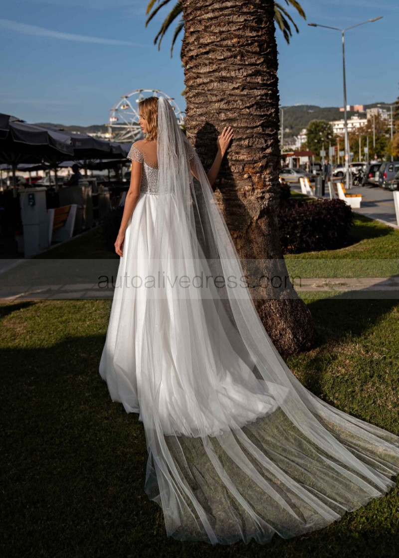 Short Sleeves Beaded Ivory Lace Glitter Tulle Slit Wedding Dress