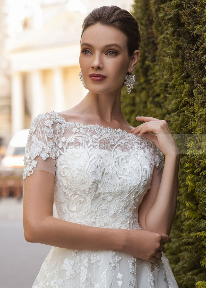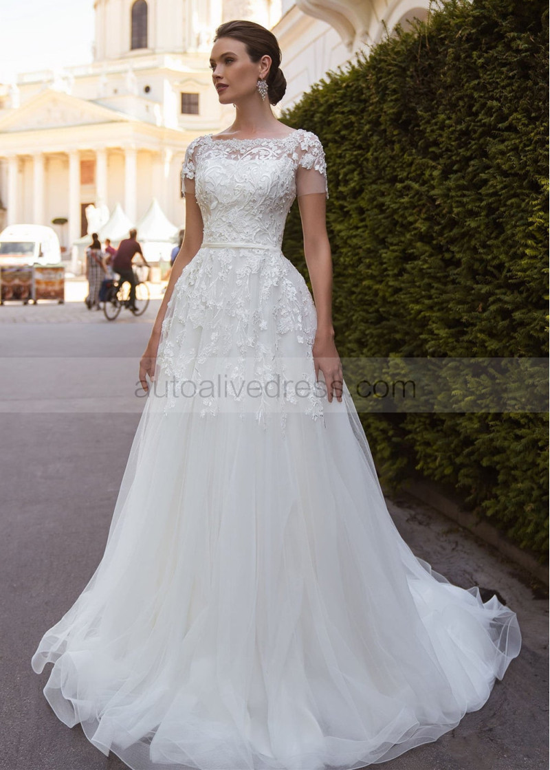 Short Sleeves Beaded White Lace Tulle Wedding Dress