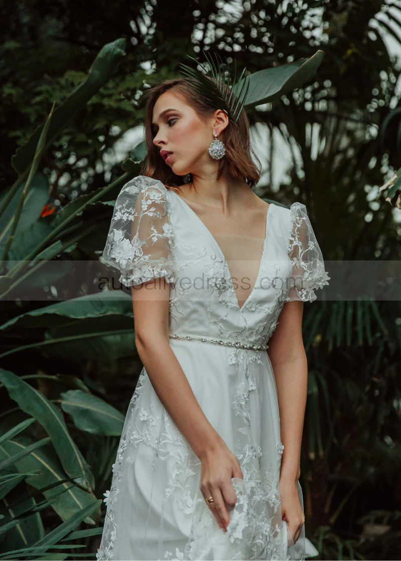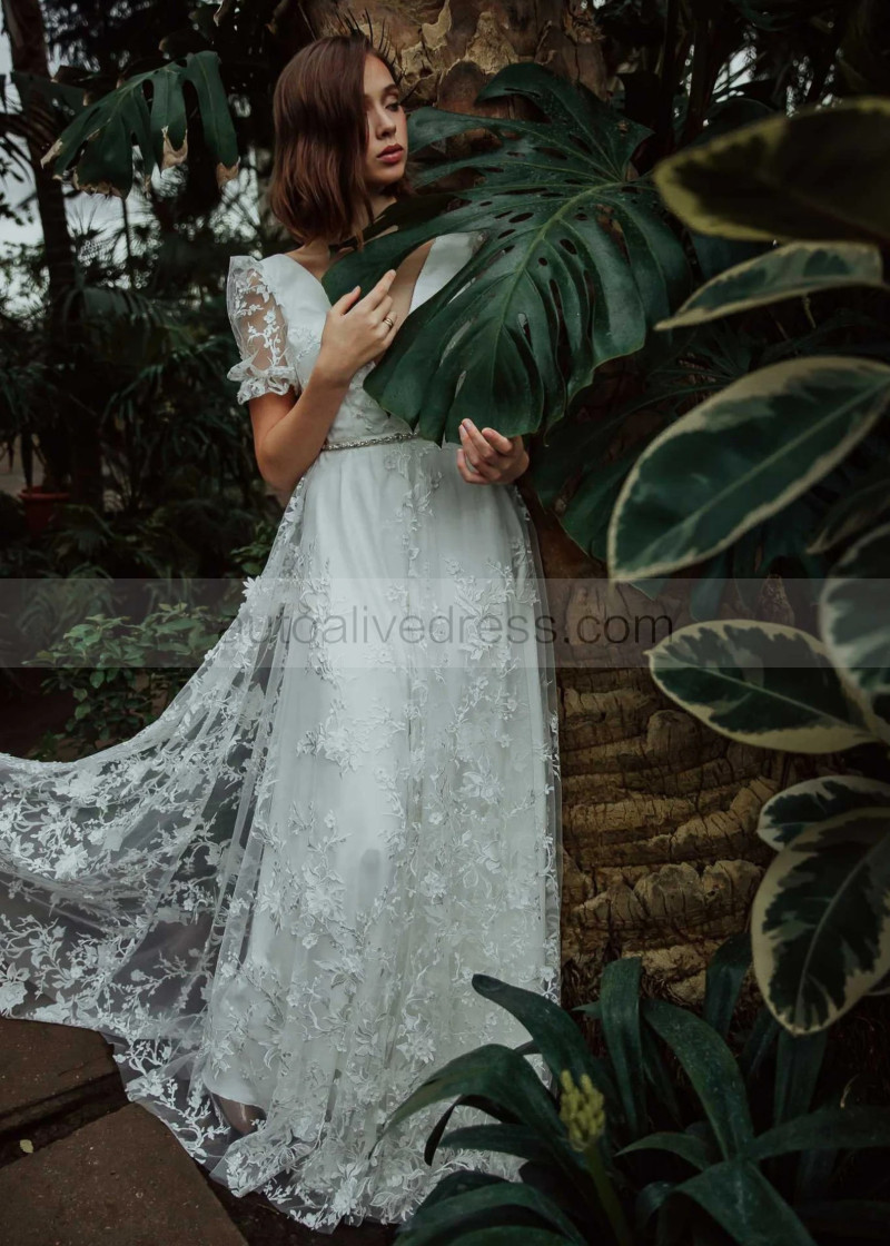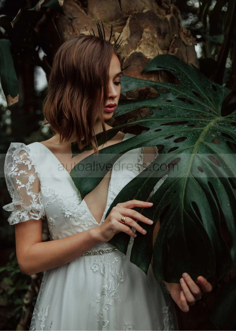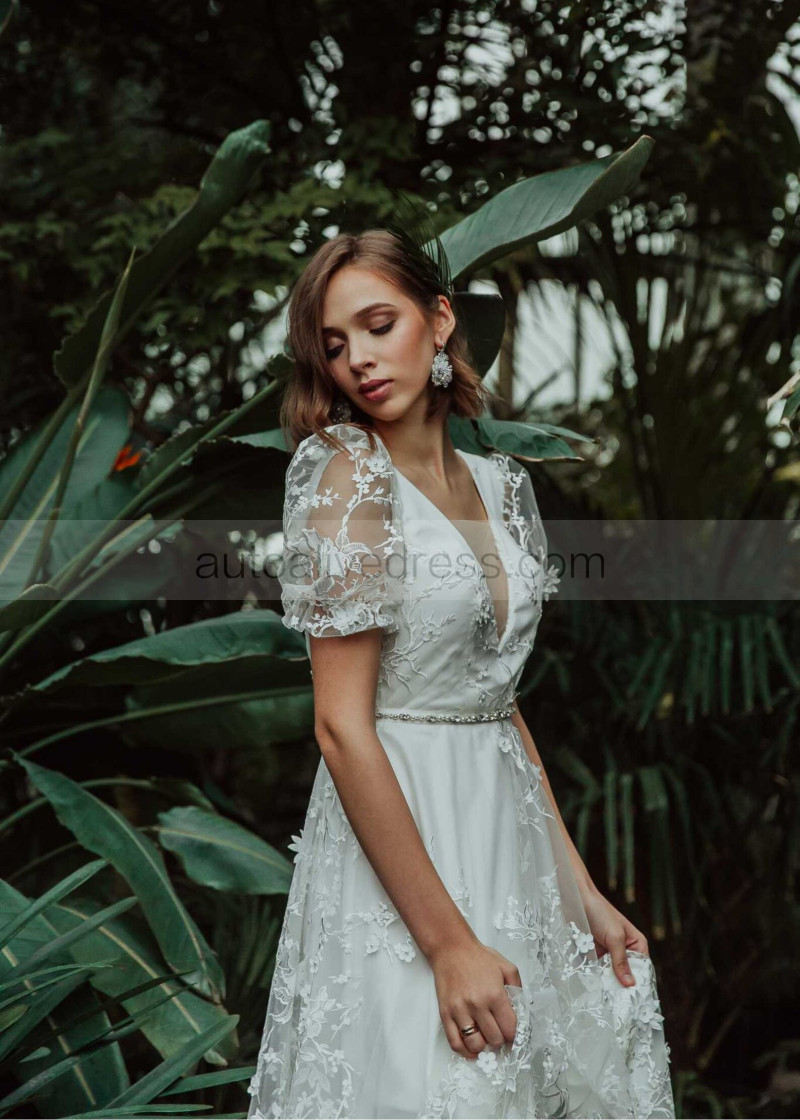 Short Sleeves Ivory 3D Lace Tulle Wedding Dress With Beaded Sash