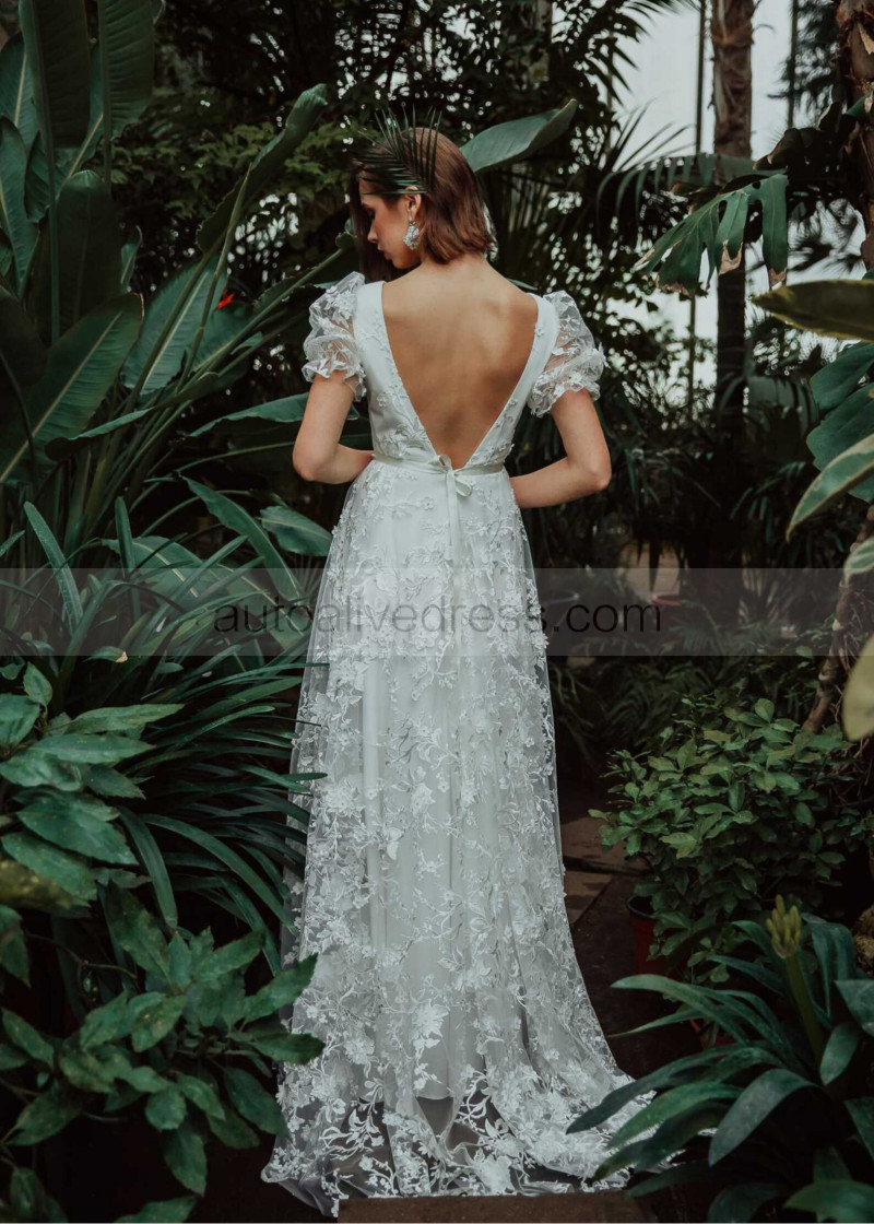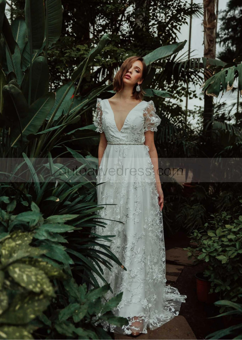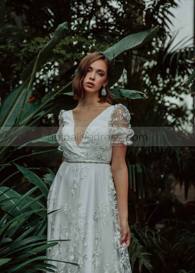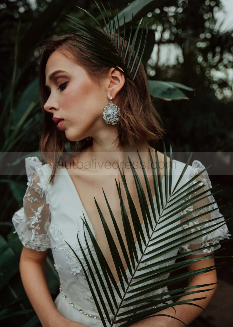 Short Sleeves Ivory 3D Lace Tulle Wedding Dress With Beaded Sash