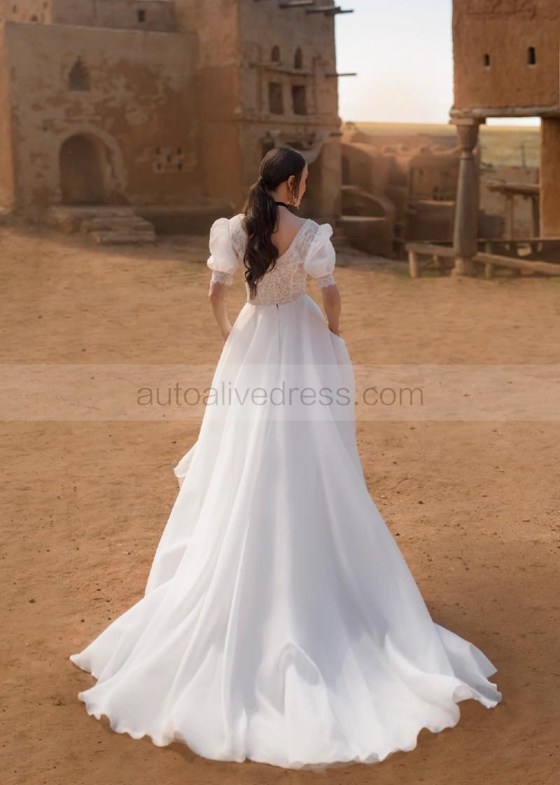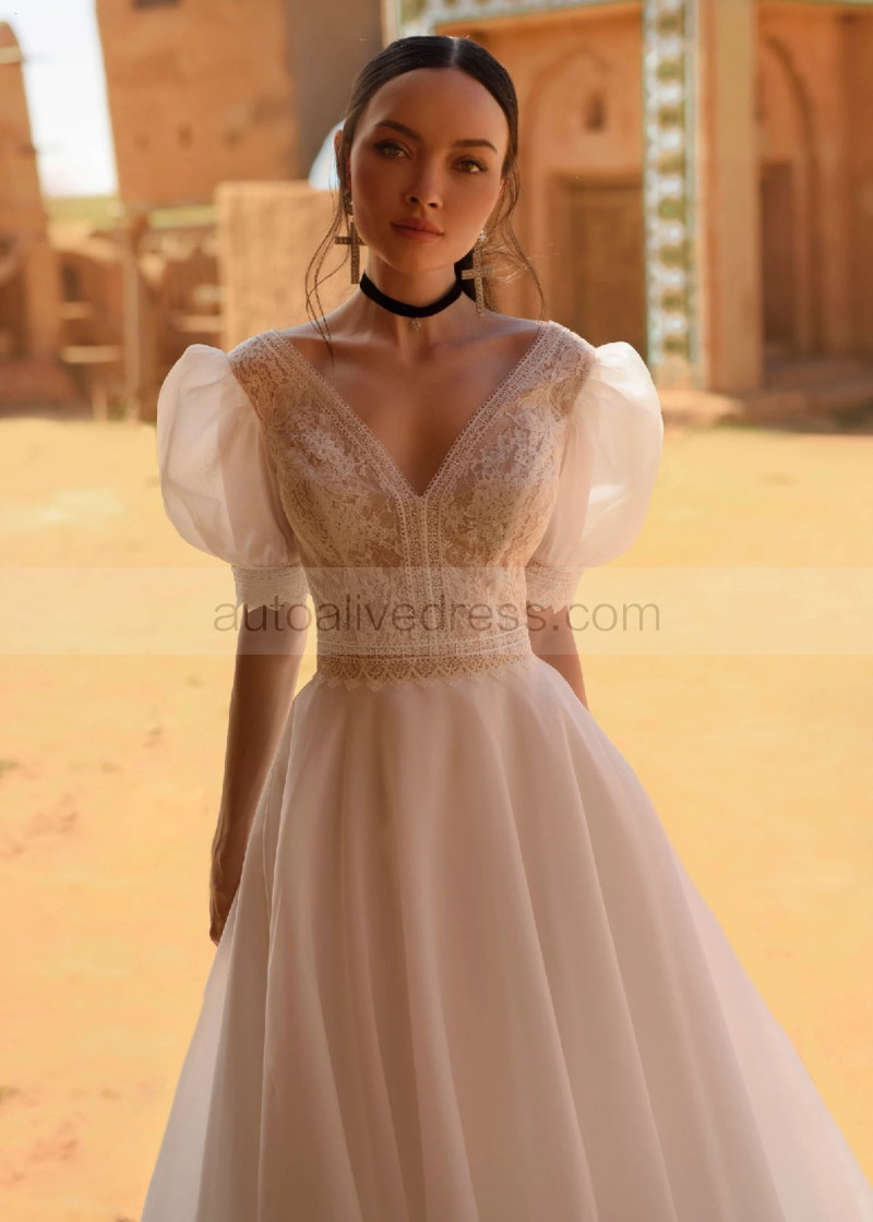 Short Sleeves Ivory Lace Chiffon Boho Beach Wedding Dress
