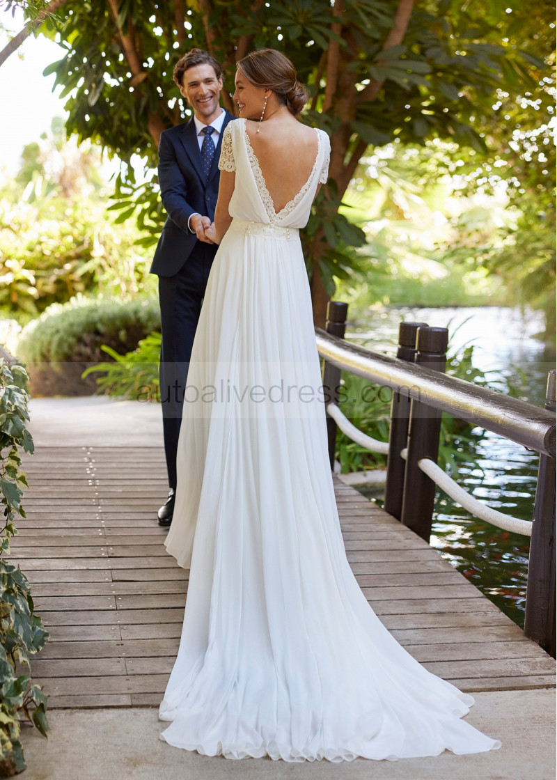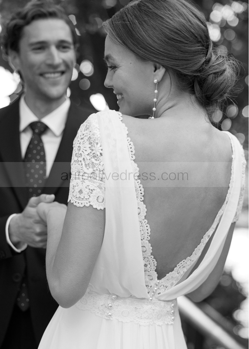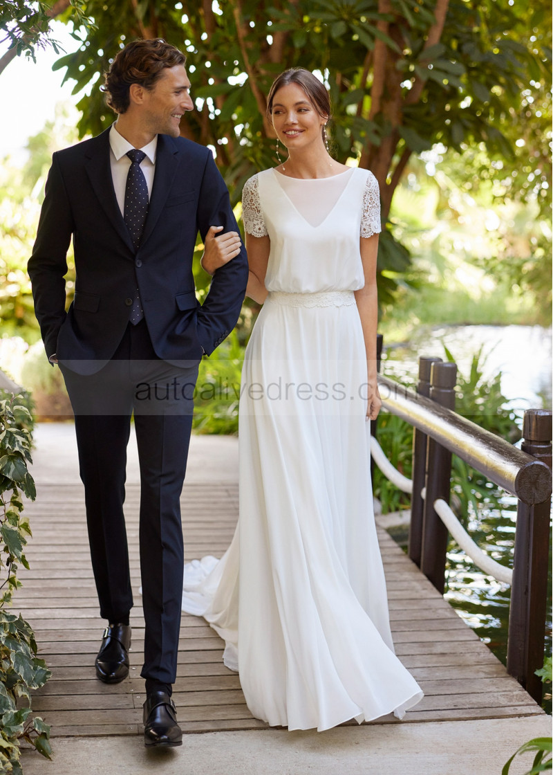 Short Sleeves Ivory Lace Chiffon Wedding Dress With Detachable Train