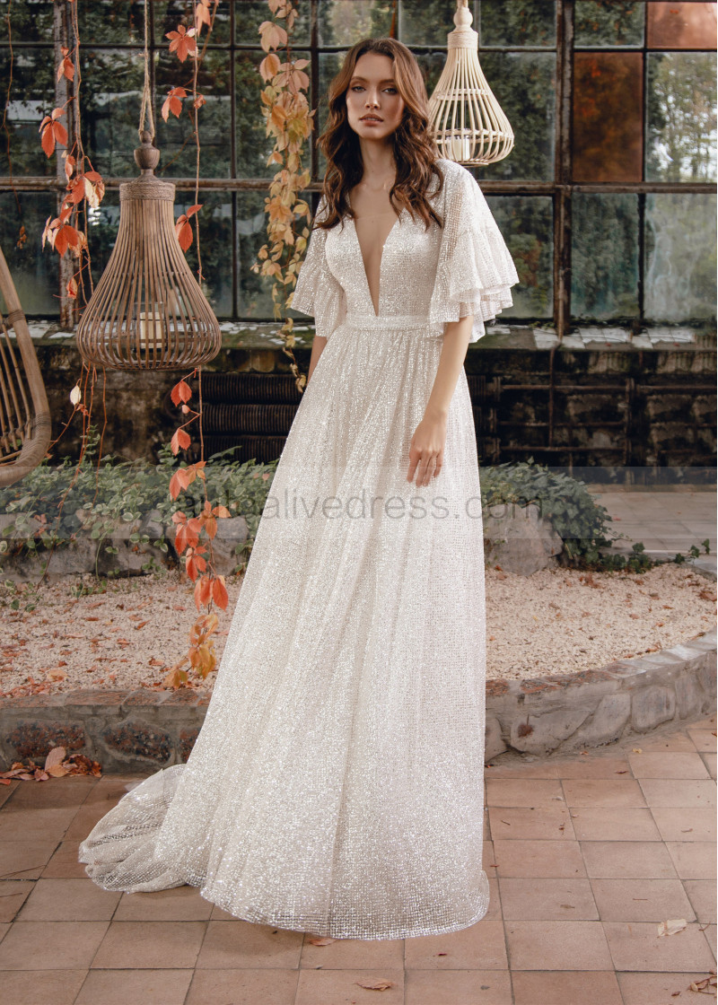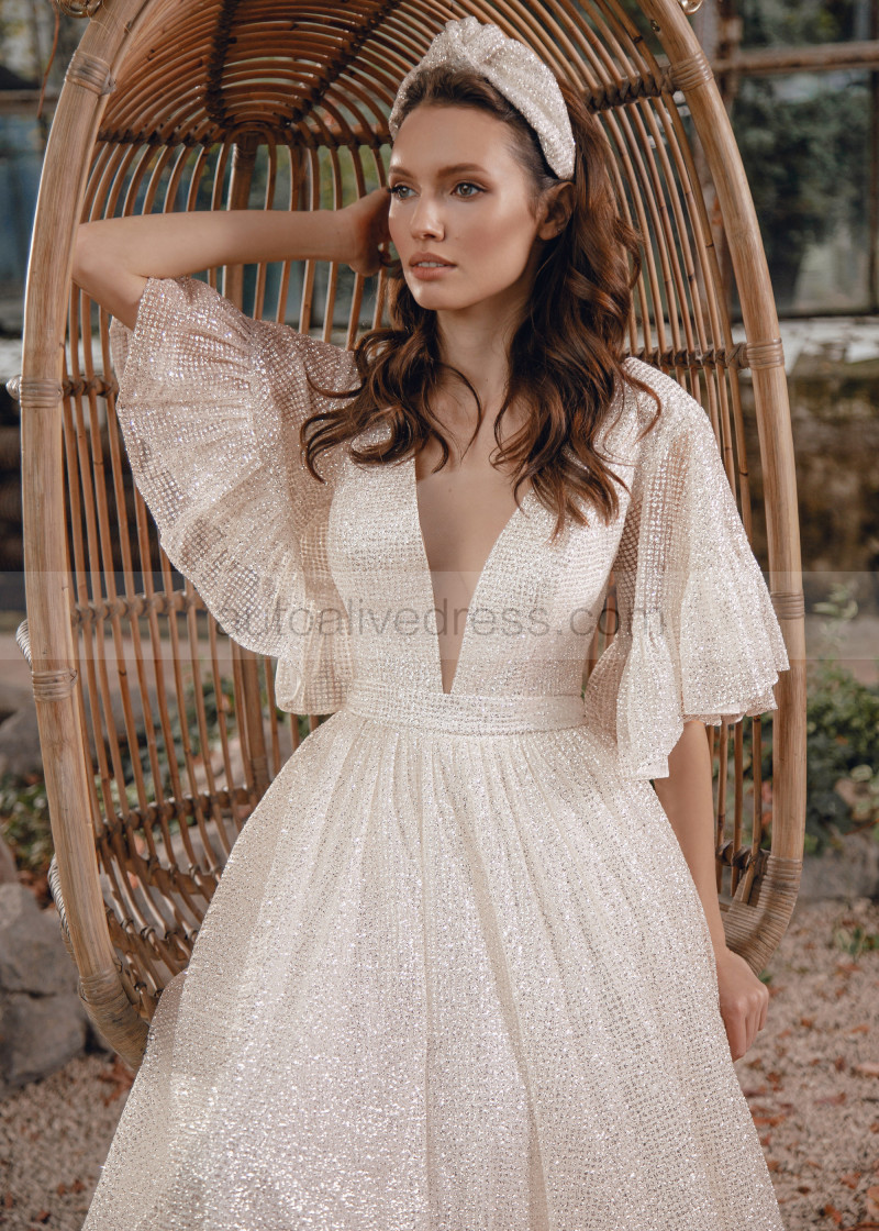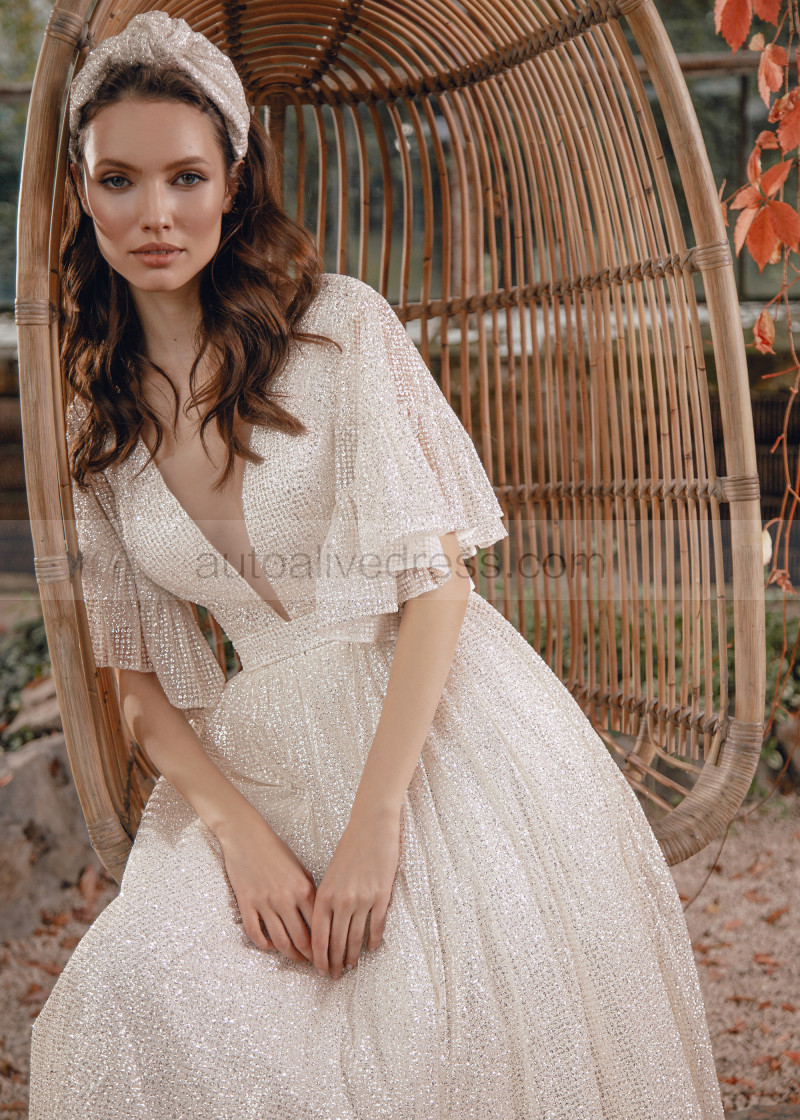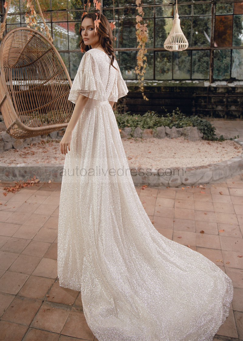 Silver Glitter Buttons Back Wedding Dress