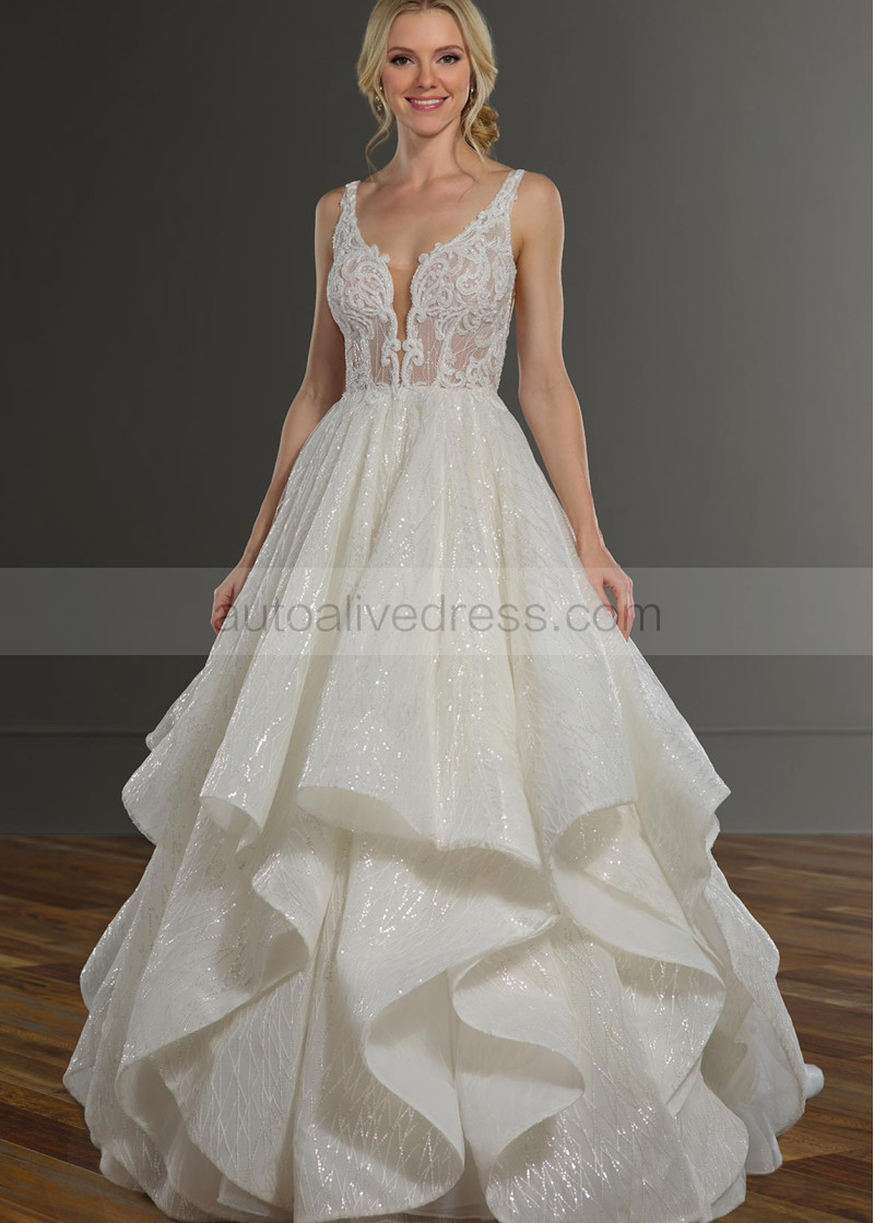 Sleeveless Ivory Lace Ruffle Skirt V Back Wedding Dress